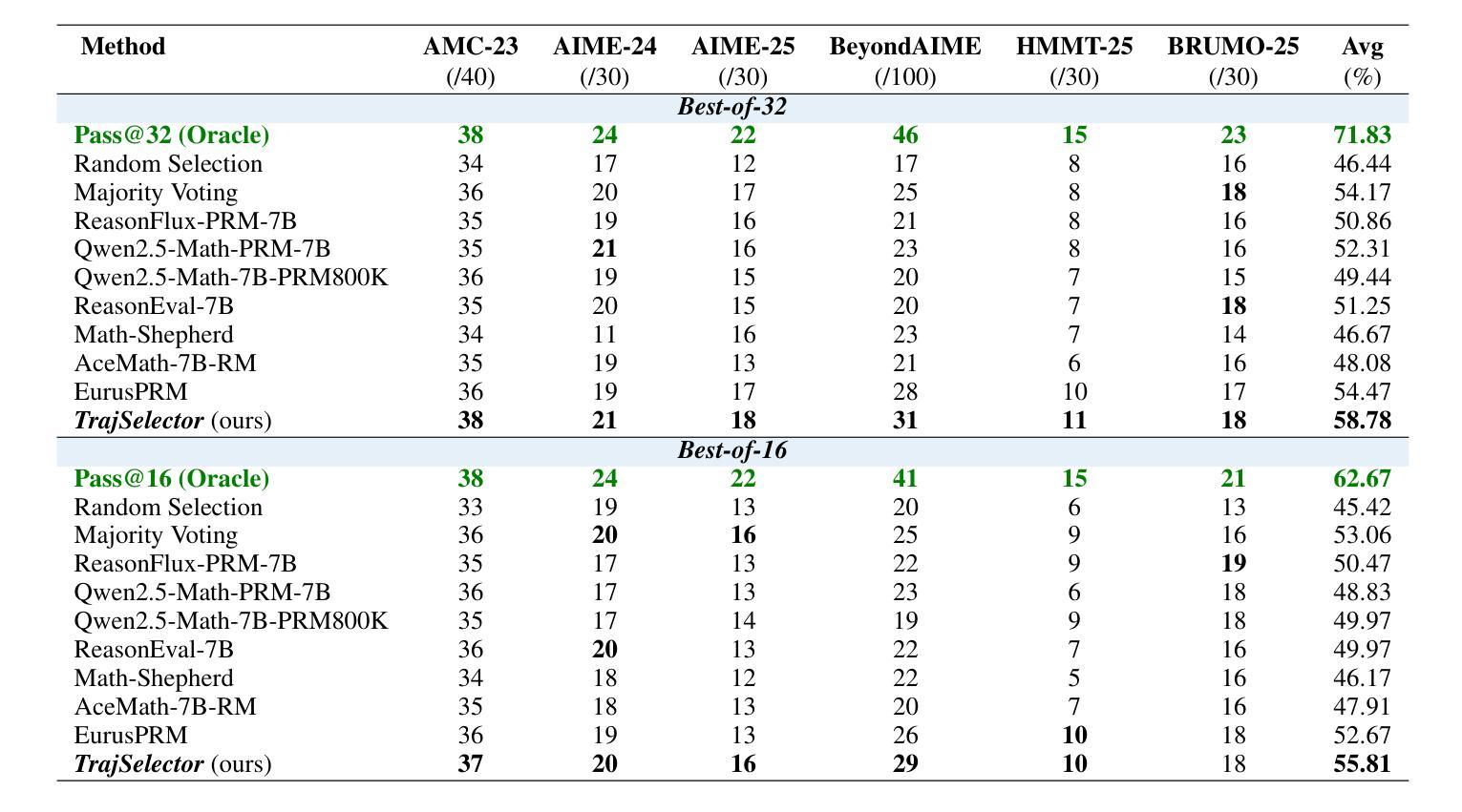 - TrajSelector框架利用LLM中的隐藏状态进行过程级评分,提高了效率。