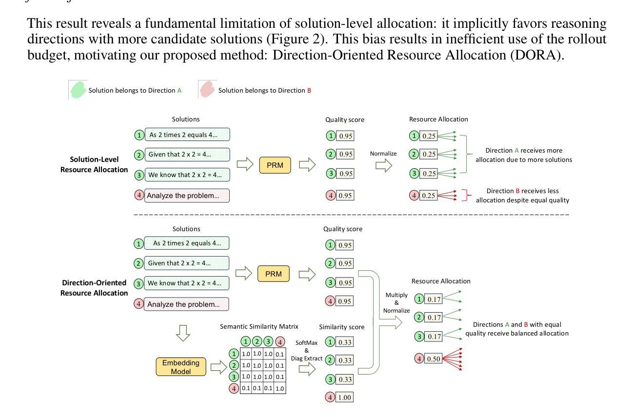- 文章提出一种新型的资源分配策略,称为方向导向资源分配(DORA)。该方法克服了现有方法的缺陷,并通过减少方向质量和候选数量之间的耦合来实现计算资源的方向级别分配。
