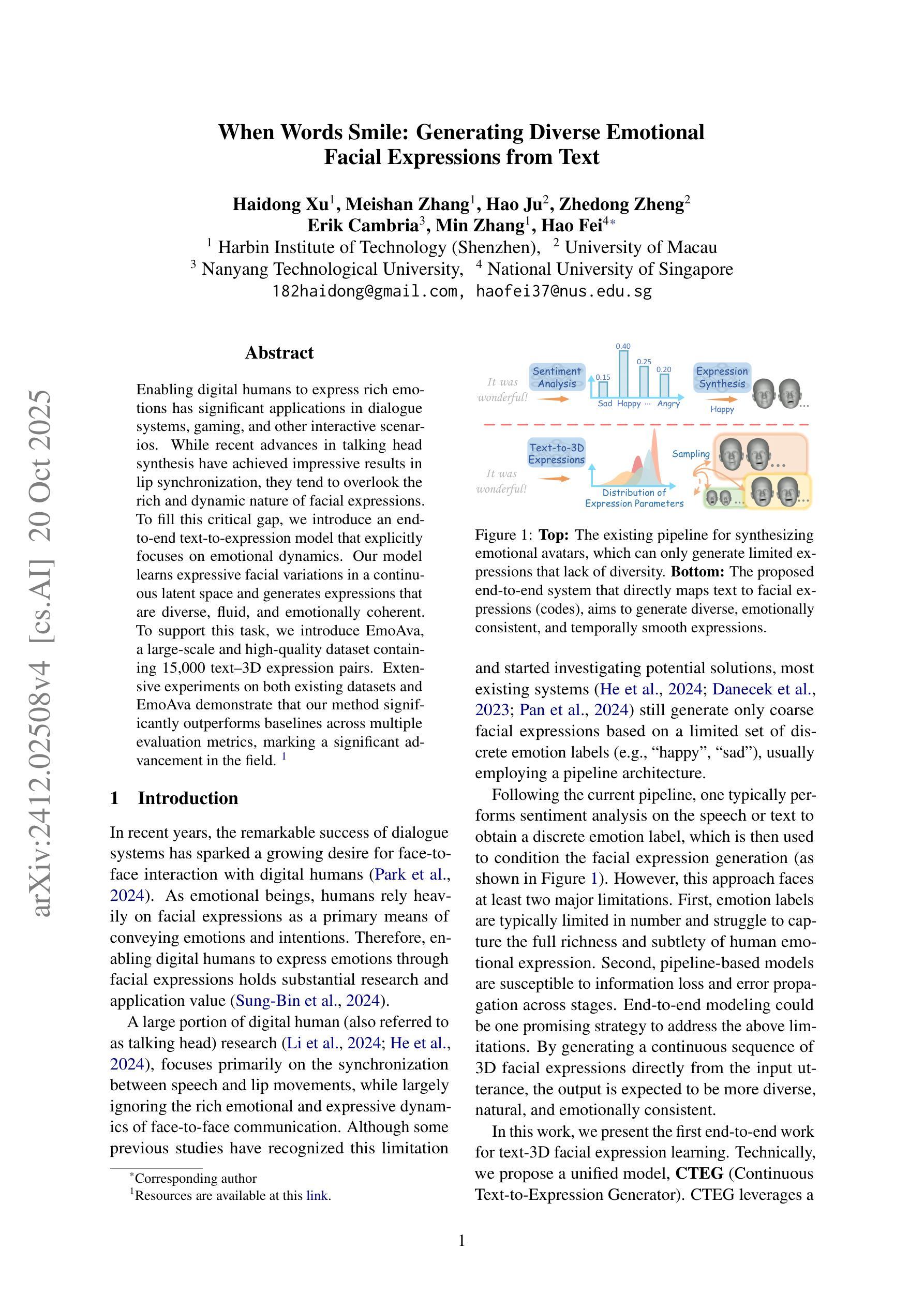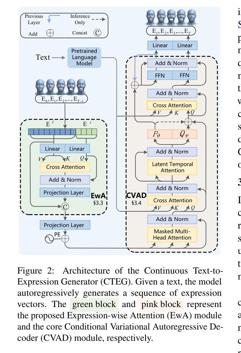 使数字人类能够表达丰富的情绪在对话系统、游戏和其他交互场景中具有重要应用。尽管最近在说话人头部合成方面的进展在嘴唇同步方面取得了令人印象深刻的结果,但它们往往忽视了面部表情的丰富性和动态性。为了填补这一关键空白,我们引入了一个端到端的文本到表情模型,该模型明确地专注于情感动态。我们的模型在连续的潜在空间中学习表情面部变化,并生成多样、流畅、情感连贯的表达式。为了支持此任务,我们推出了EmoAva数据集,这是一个包含15,000个文本-3D表情对的大型高质量数据集。在现有数据集和EmoAva上的大量实验表明,我们的方法在多个评价指标上显著优于基线,标志着该领域的重大进展。
