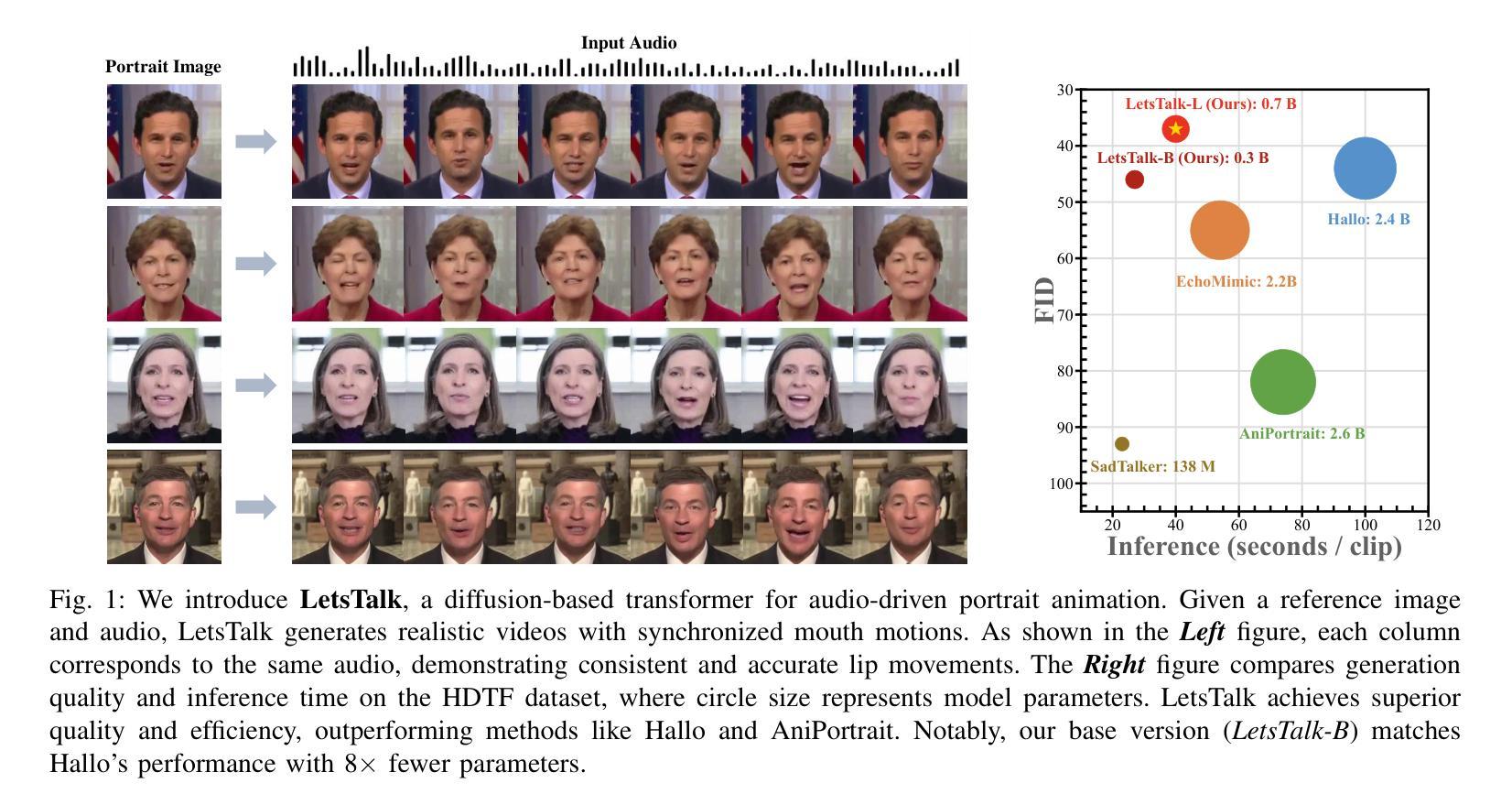 - LetsTalk方法基于扩散变压器框架解决长时视频合成挑战。