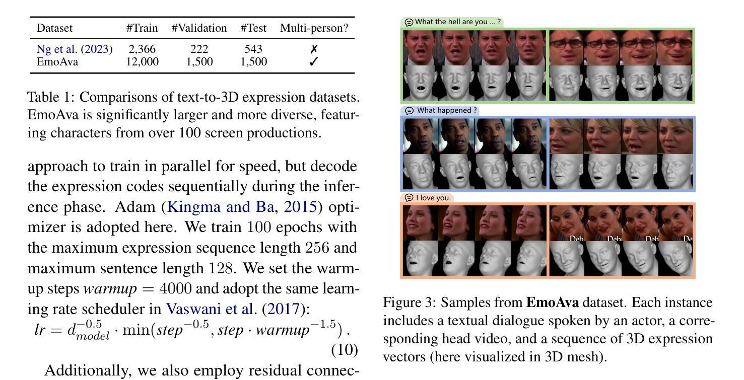 - 引入EmoAva数据集,支持表情生成任务,包含大量高质量文本-3D表情对。