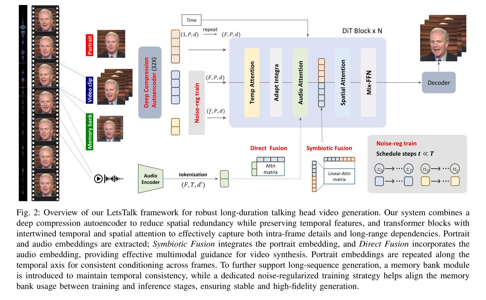 长期对话视频合成在达到高视频质量、肖像和时序一致性以及计算效率方面持续面临挑战。随着视频长度的增加,视觉退化、身份不一致、时序不一致和误差累积等问题变得越来越严重,严重影响了结果的真实性和可靠性。为了解决这些挑战,我们推出了LetsTalk,这是一款配备多模式指导和新型内存银行机制的扩散变压器框架,明确地保持了上下文连续性,并实现了长期对话视频的稳定、高质量和高效生成。特别地,LetsTalk引入了一个噪声正则化内存银行,以减轻扩展视频生成过程中的误差累积和采样伪影。为了进一步提高效率和时空一致性,LetsTalk采用深度压缩自动编码器和具有线性注意力的时空感知变压器,以实现有效的多模式融合。我们系统地分析了三种融合方案,并表明结合深度(共生融合)进行肖像特征和浅层(直接融合)进行音频融合,可实现卓越视觉真实感和精确语音驱动运动,同时保持运动多样性。大量实验表明,LetsTalk在生成质量方面达到了新的先进技术水平,产生了具有增强多样性和生动性的时间连贯和真实的对话视频,并且与以前的方法相比,保持了显著效率,参数减少了8倍。