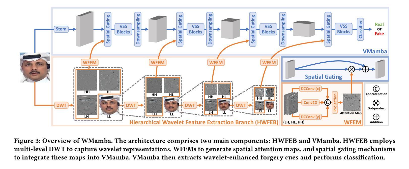 随着深度伪造生成技术的快速发展,需要开发稳健的人脸伪造检测算法。最近的研究表明,小波分析可以提高伪造检测器的泛化能力。小波能够有效地捕捉面部关键轮廓,这些轮廓通常细长、精细且全局分布,可能隐藏了在空间域中无法察觉的细微伪造痕迹。然而,当前基于小波的方法未能充分利用小波数据的独特属性,导致特征提取不足和性能提升有限。为了解决这一挑战,我们引入了WMamba,这是一种新型的小波特征提取器,基于Mamba架构。WMamba通过两个关键创新来最大化小波信息的使用价值。首先,我们提出了动态轮廓卷积(DCConv),它采用专门设计的可变形内核来自适应地模拟细长的面部轮廓。其次,通过利用Mamba架构,我们的方法以线性复杂度捕获远程空间关系。这种效率允许从小图像块中提取精细、全局分布的伪造痕迹。大量实验表明,WMamba达到了最新技术水平(SOTA),突显其在人脸伪造检测中的有效性。