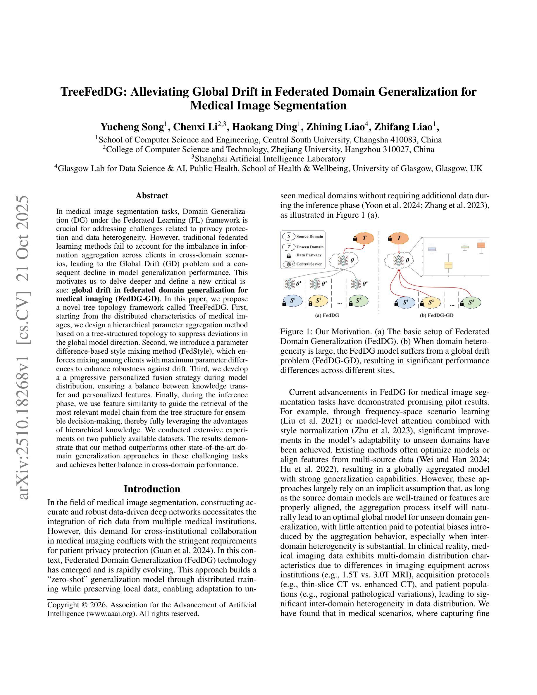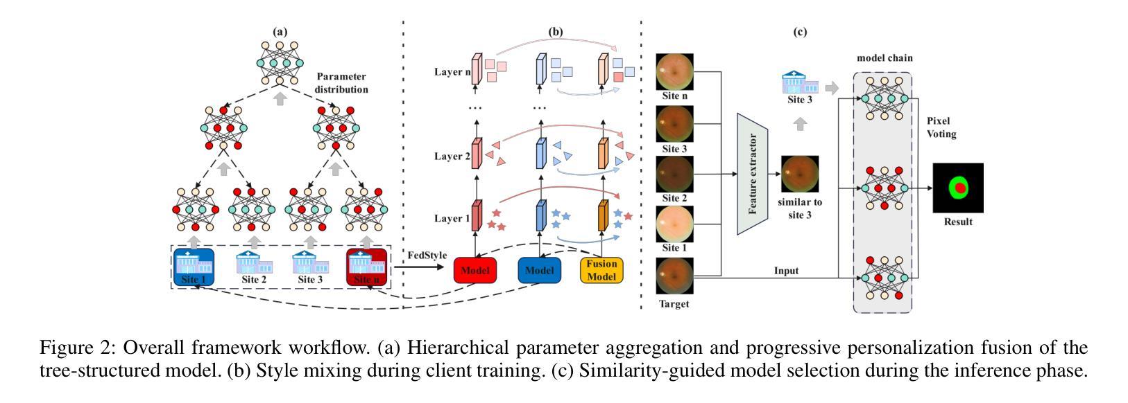 本文研究了医学图像分割任务中联邦学习框架下的域泛化问题。针对跨域场景中信息聚合不平衡导致的全局漂移问题,提出了新型树拓扑框架TreeFedDG。通过层次参数聚合方法、参数差异风格混合方法和渐进个性化融合策略,提高了模型的泛化性能和鲁棒性。实验结果表明,该方法在挑战性任务上优于其他最先进的域泛化方法,实现了跨域性能的更好平衡。
