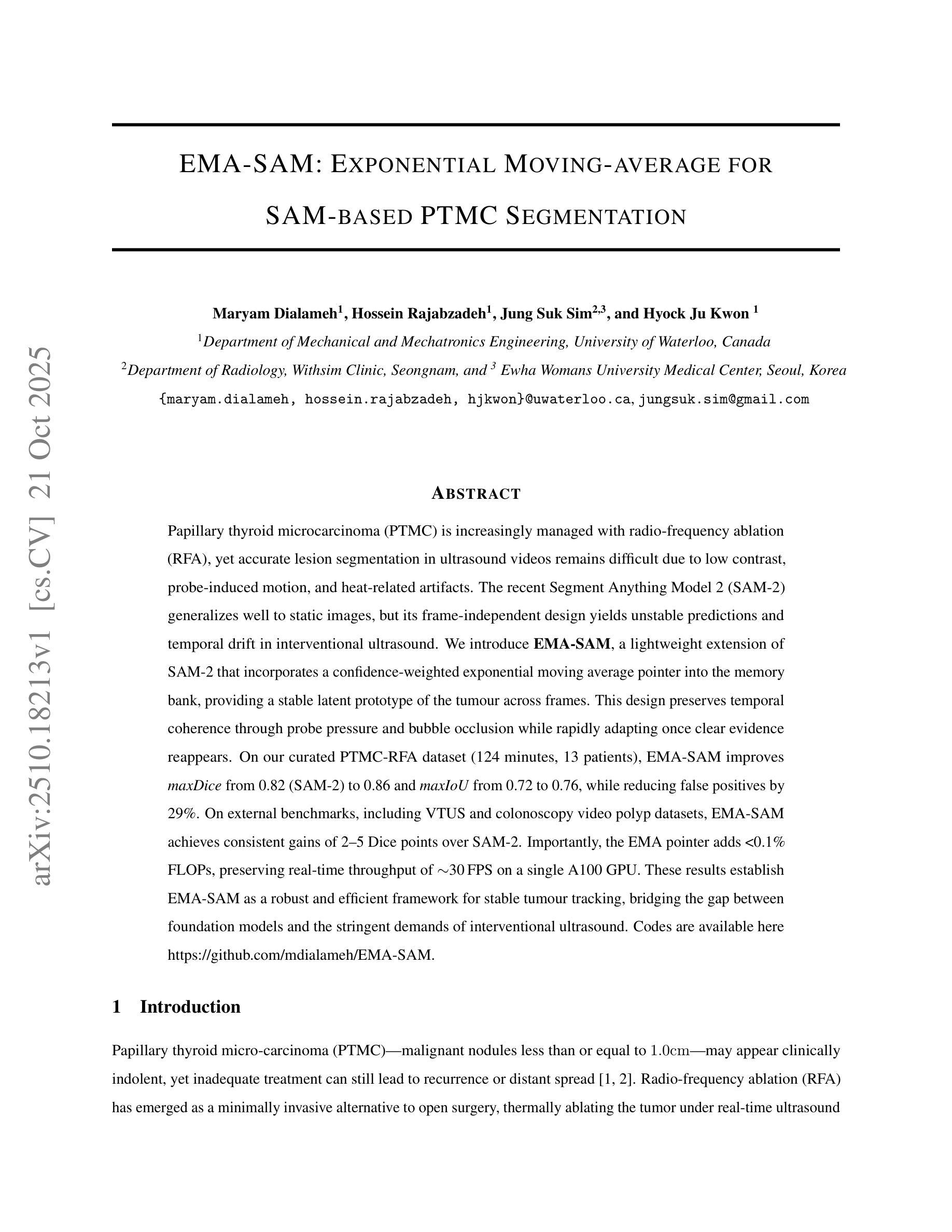 甲状腺微小乳头状癌(PTMC)越来越多地采用射频消融(RFA)进行治疗,但由于超声视频中的低对比度、探针引起的运动以及热相关伪影,准确的病灶分割仍然是一个难题。最近的Segment Anything Model 2(SAM-2)对静态图像具有良好的通用性,但其独立于帧的设计导致预测不稳定和介入超声中的时间漂移。我们引入了EMA-SAM,它是SAM-2的一个轻量级扩展,它将置信度加权指数移动平均指针引入到内存银行中,为跨帧的肿瘤提供了一个稳定的潜在原型。这种设计在探头压力和气泡闭塞时会保留时间的连贯性,当清晰的证据再次出现时能够迅速适应。在我们的定制的PTMC-RFA数据集上(124分钟,13名患者),EMA-SAM将最大Dice系数从SAM-2的0.82提高到0.86,最大IoU从0.72提高到0.76,同时减少了假阳性结果达29%。在外部基准测试中,包括VTUS和结肠镜检查视频息肉数据集,EMA-SAM相较于SAM-2实现了稳定的增益,Dice点数提高了2-5点。重要的是,EMA指针增加了不到0.1%的FLOPs,在单个A100 GPU上保持了约30 FPS的实时吞吐量。这些结果证明了EMA-SAM是一个稳健且高效的框架,用于稳定的肿瘤追踪,缩小了基础模型与介入超声的严格需求之间的差距。代码可通过此链接获得:https://github.com/mdialameh/EMA-SAM。
