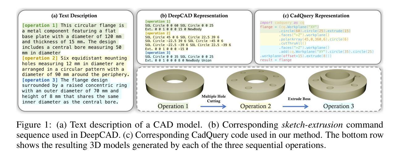 - CAD-Coder框架将文本转化为CAD设计,通过生成CadQuery脚本实现,支持直接几何验证和丰富的建模语言。