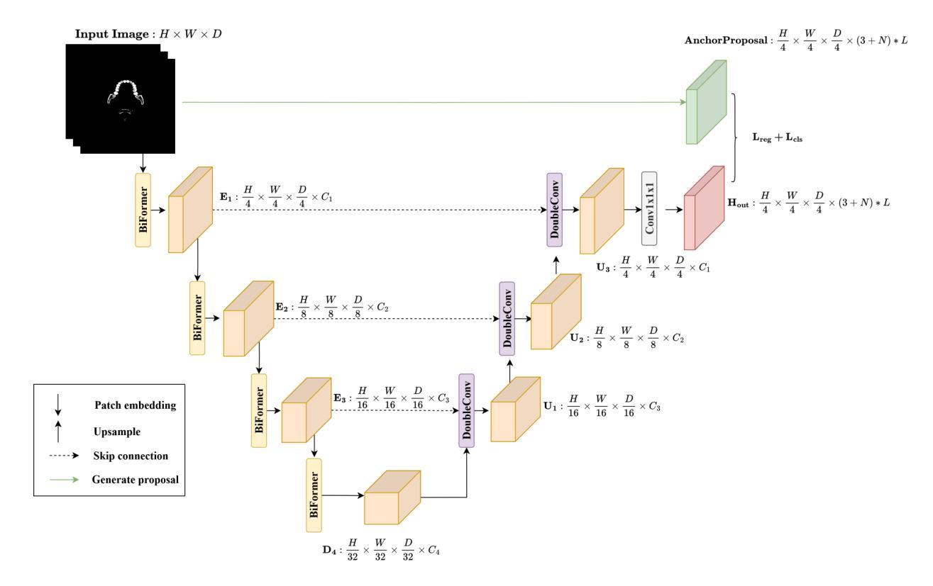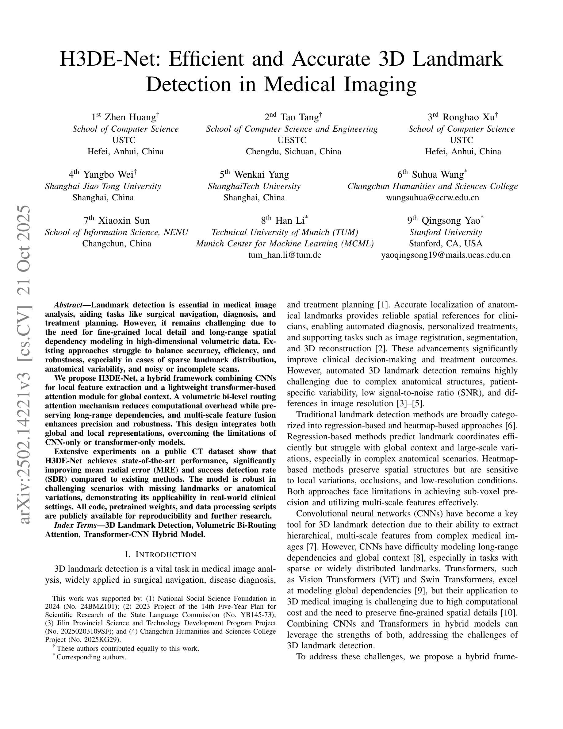 本文提出一种混合三维检测网络(H3DE-Net),结合卷积神经网络(CNN)进行局部特征提取,并采用轻量级注意力机制高效捕捉三维体积数据中的全局依赖关系。该方法采用分层路由策略,降低计算成本的同时保持全局上下文建模。实验结果表明,H3DE-Net在公开CT数据集上达到最新技术水平,提高了准确性和鲁棒性,特别是在缺失地标或复杂解剖变异情况下。