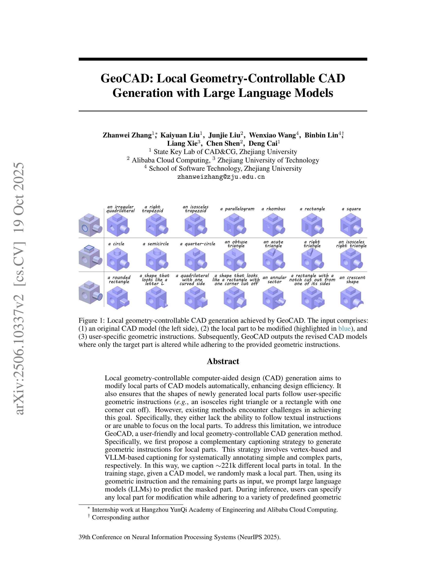 局部几何可控计算机辅助设计(CAD)生成旨在自动修改CAD模型的部分,提高设计效率。同时,它还能确保新生成的局部部件的形状符合用户特定的几何指令(例如,等腰直角三角形或切掉一角的矩形)。然而,现有方法在实现这一目标时面临挑战。具体来说,它们要么无法遵循文本指令,要么无法专注于局部部件。为了解决这一局限性,我们引入了GeoCAD,这是一种用户友好、局部几何可控的CAD生成方法。具体来说,我们首先提出了一种补充标题策略,为局部部件生成几何指令。该策略包括基于顶点和基于VLLM的标题,分别用于系统注释简单和复杂部件。通过这种方式,我们总共标注了约22万1千个不同的局部部件。在训练阶段,给定一个CAD模型,我们随机遮挡一个局部部件。然后,利用其几何指令和剩余部件作为输入,我们提示大型语言模型(LLM)预测被遮挡的部分。在推理阶段,用户可以指定任何局部部件进行修改,同时遵循多种预定义的几何指令。大量实验表明,GeoCAD在生成质量、有效性和文本到CAD的一致性方面都非常有效。代码将在https://github.com/Zhanwei-Z/GeoCAD上提供。