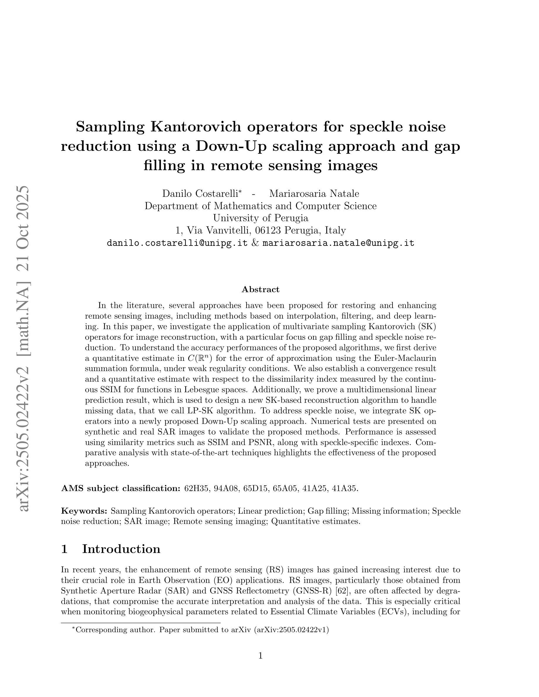 在文献中,已经提出了多种用于恢复和增强遥感图像的方法,包括基于插值、滤波和深度学习的方法。本文研究了多元采样Kantorovich(SK)算子在图像重建中的应用,特别关注间隙填充和斑点噪声减少。为了了解所提出算法的准确性能,我们首先利用欧拉-麦克劳林求和公式,在较弱的正则条件下,对近似误差进行了定量估计。我们还建立了关于勒贝格空间中函数的不相似性指数测量的收敛结果和定量估计,并证明了多维线性预测结果,该结果用于设计一种处理缺失数据的新SK重建算法,我们称之为LP-SK算法。为解决斑点噪声问题,我们将SK算子集成到新提出的上下缩放方法中。对合成和真实SAR图像进行了数值测试,以验证所提出的方法。性能评估使用SSIM和PSNR等相似度度量以及斑点特定指标。与最新技术的比较分析突出了所提出方法的有效性。
