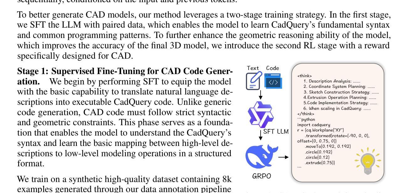 - 框架采用两阶段学习管道,包括监督微调与强化学习,提高代码有效性和几何保真度。