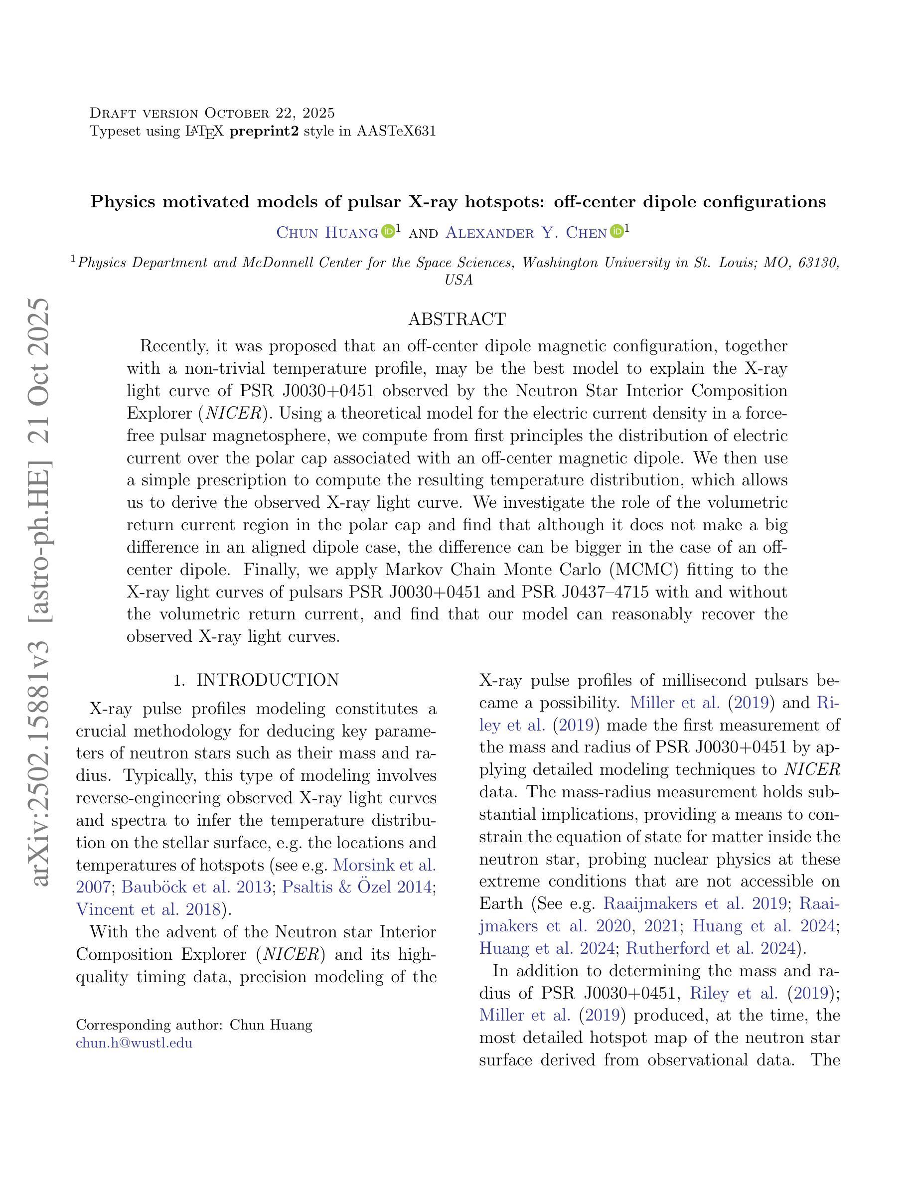 最近,有提议认为非中心偶极磁场配置与非常规温度分布相结合可能是解释由中子星内部结构探测器(NICER)观察到的PSR J0030+0451的X射线光变的最佳模型。我们使用自由力偶极脉冲星磁层中的电流密度理论模型,从第一原理出发计算非中心磁偶极极冠上的电流分布。然后,我们使用一个简单的公式来计算所得的温度分布,从而推导出观察到的X射线光变曲线。我们研究了体积返回电流区域在极冠中的作用,发现虽然在偶极对齐的情况下差异不大,但在非中心偶极的情况下差异可能更大。最后,我们对包含和不包含体积返回电流的脉冲星PSR J0030+0451和PSR J0437-4715的X射线光变曲线应用马尔可夫链蒙特卡洛(MCMC)拟合方法,发现我们的模型可以合理地恢复观察到的X射线光变曲线。