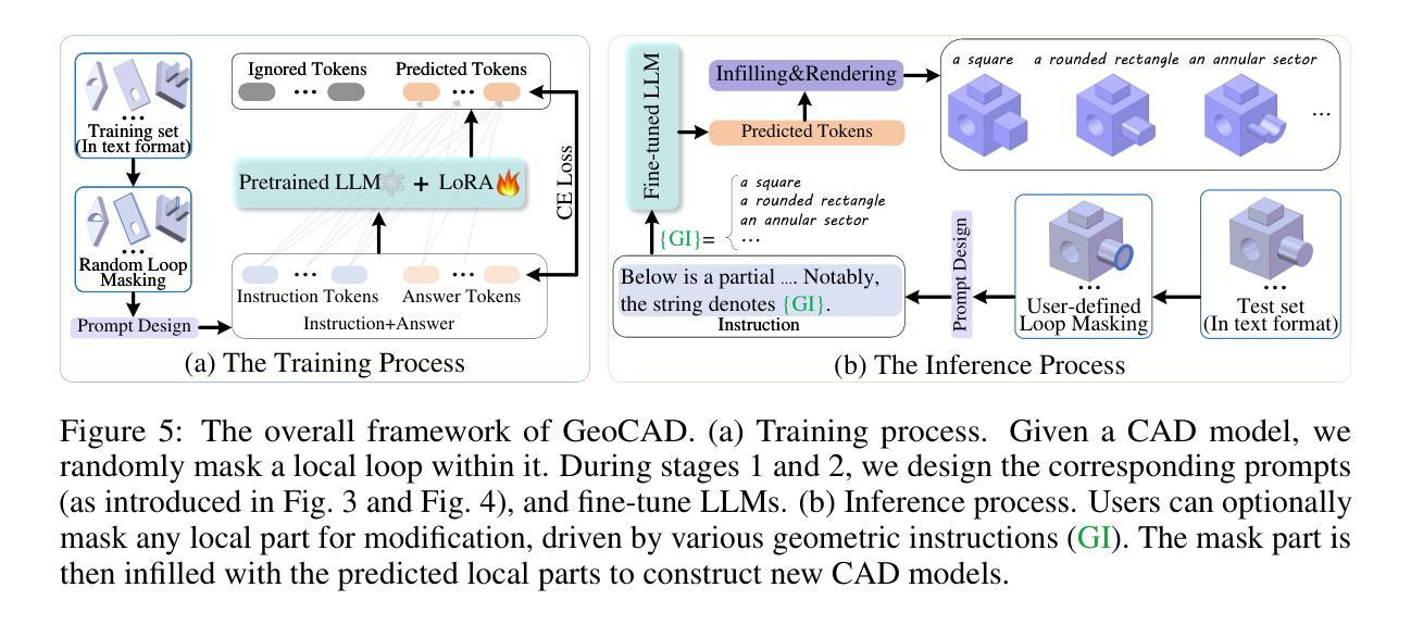 - 在训练阶段,GeoCAD通过随机遮挡CAD模型中的局部部件,并利用大型语言模型进行预测。