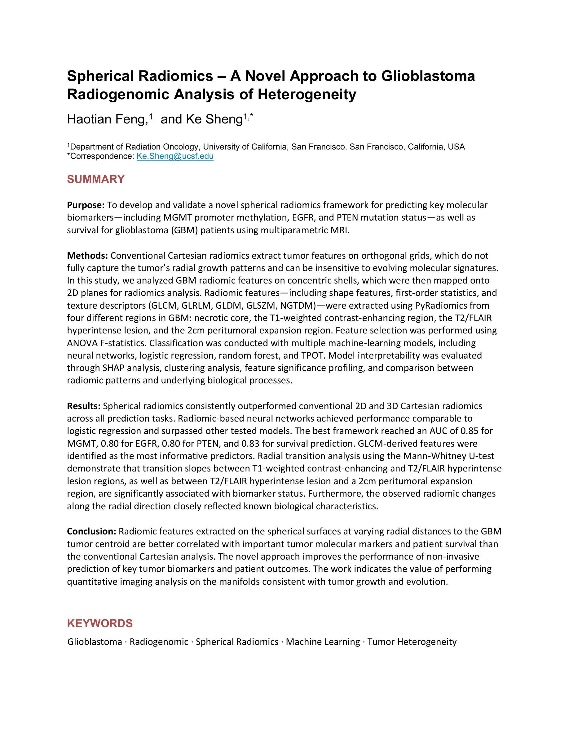 - 开发并验证了一种新型球形放射学框架,用于利用多参数MRI预测关键分子生物标志物。