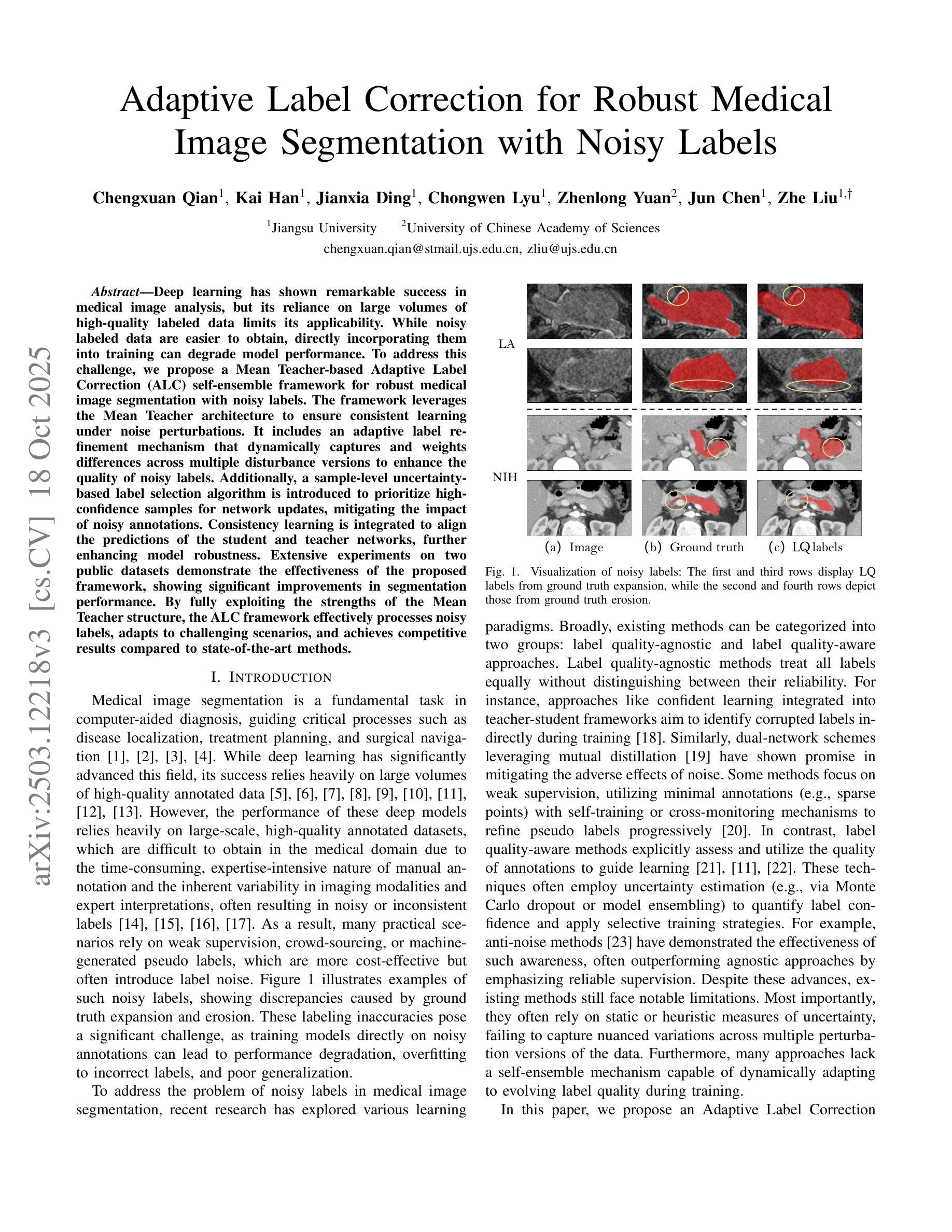 深度学习在医学图像分析方面取得了显著的成就,但其依赖于大量高质量标注数据的特性限制了其应用范围。虽然获取带噪声的标注数据更容易,但直接将其纳入训练会降低模型性能。为了应对这一挑战,我们提出了一种基于Mean Teacher的自适应标签校正(ALC)自集成框架,用于稳健的医学图像分割,该框架带有噪声标签。该框架利用Mean Teacher架构确保在噪声扰动下的持续学习。它包含一个自适应标签优化机制,该机制能够动态捕获并权衡多个扰动版本之间的差异,以提高噪声标签的质量。此外,引入了一种基于样本级别不确定性的标签选择算法,以优先处理高置信度样本进行网络更新,减轻噪声注释的影响。集成一致性学习以对齐学生和教师网络的预测,进一步提高模型的稳健性。在两个公共数据集上的大量实验证明了所提框架的有效性,显示出分割性能的显著提高。通过充分利用Mean Teacher结构的优势,ALC框架有效地处理了噪声标签,适应了具有挑战性的场景,并与最先进的方法相比取得了具有竞争力的结果。