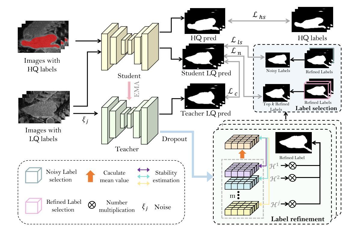 深度学习在医学图像分析领域取得了显著的成功,但其依赖于大量高质量标注数据的应用范围有限。为了处理带噪声标签数据带来的问题,我们提出了基于Mean Teacher的自适应标签修正(ALC)自集成框架,用于稳健医学图像分割。该框架利用Mean Teacher架构确保在噪声扰动下的学习一致性,并包括自适应标签优化机制,动态捕捉并权衡不同扰动版本之间的差异,以提高噪声标签的质量。此外,引入了基于样本级别不确定性的标签选择算法,优先选取高置信度样本进行网络更新,减少噪声标注的影响。一致性学习被整合以对齐学生和教师网络的预测,进一步提高模型的稳健性。在公共数据集上的大量实验证明了该框架的有效性,在分割性能上取得了显著的提升。