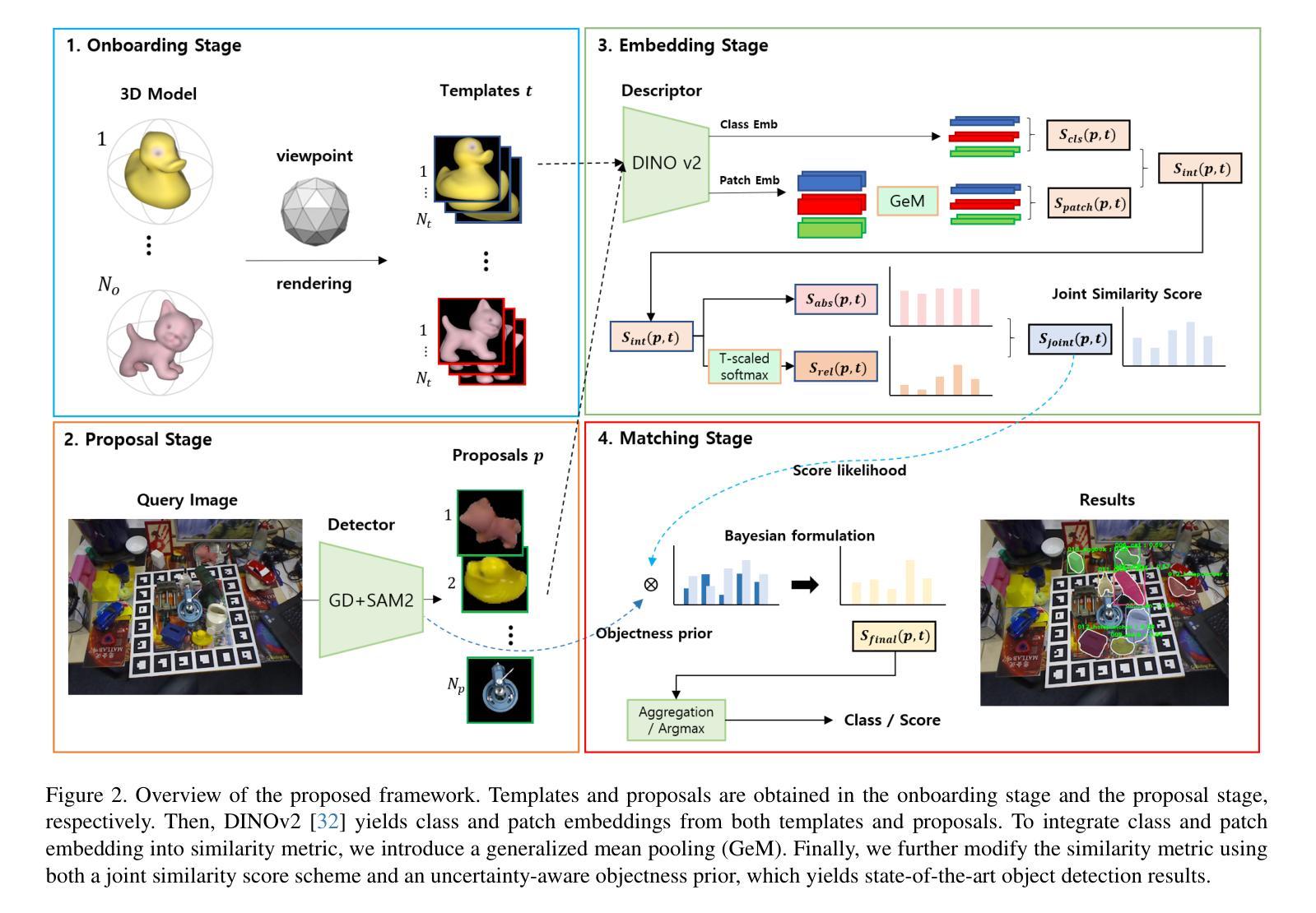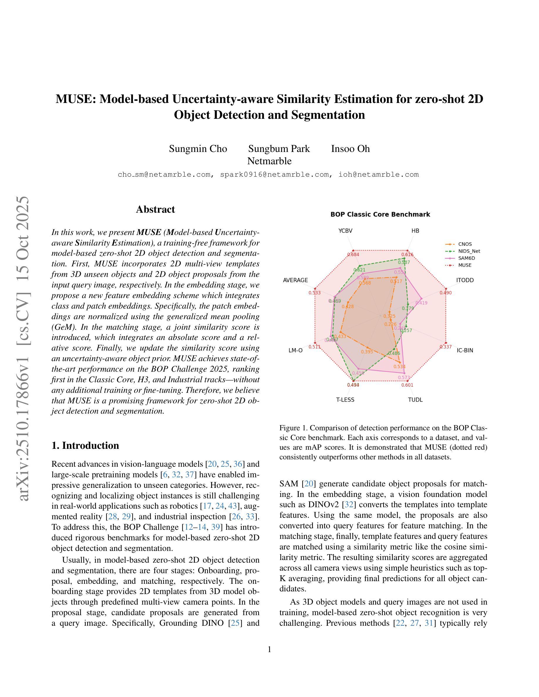 模型无关的零样本二维目标检测和分割框架MUSE被引入。它利用三维未见物体的二维多视图模板和输入查询图像中的二维目标提案。通过嵌入阶段和匹配阶段的处理,MUSE实现了高效的全局和局部表示,并在不确定性感知的对象先验知识下调整提案的可靠性,提升了匹配的稳健性。在不进行任何额外训练或微调的情况下,MUSE在BOP挑战2025上取得了卓越的性能,在经典核心、H3和工业领域均排名第一,展现出其强大的通用性。