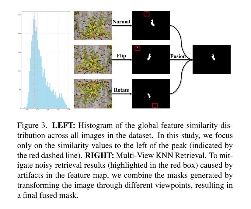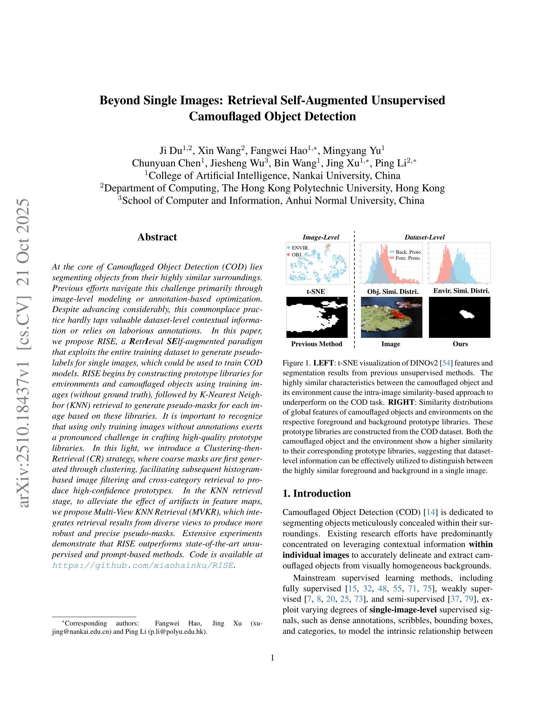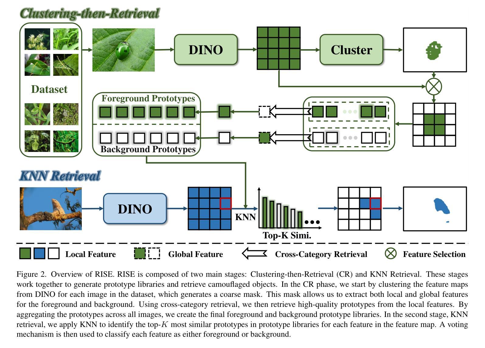 隐蔽物体检测的核心在于从与物体高度相似的周围环境中分割出物体。之前的研究主要通过图像级别的建模或基于标注的优化来应对这一挑战。尽管这种方法相当普遍且有所进展,但它很少利用宝贵的数据集级别的上下文信息,也依赖于繁琐的标注。在本文中,我们提出了RISE,一种利用整个训练数据集为单张图像生成伪标签的检索自增强范式,可用于训练COD模型。RISE首先使用训练图像(无真实标签)构建环境和隐蔽物体的原型库,然后通过K近邻检索(KNN)基于这些库为每张图像生成伪掩码。值得注意的是,仅使用无标注的训练图像在构建高质量的原型库时构成了明显的挑战。鉴于此,我们引入了一种先聚类再检索(CR)的策略,首先通过聚类生成粗略的掩码,然后基于直方图进行图像过滤和跨类别检索,以产生高置信度的原型。在KNN检索阶段,为了减轻特征图中伪影的影响,我们提出了多视图KNN检索(MVKR),它通过集成不同视图的检索结果来生成更稳健、更精确的伪掩码。大量实验表明,RISE在性能上超越了最新的无监督方法和基于提示的方法。代码可访问https://github.com/xiaohainku 详细信息请点击下方链接查看全文。