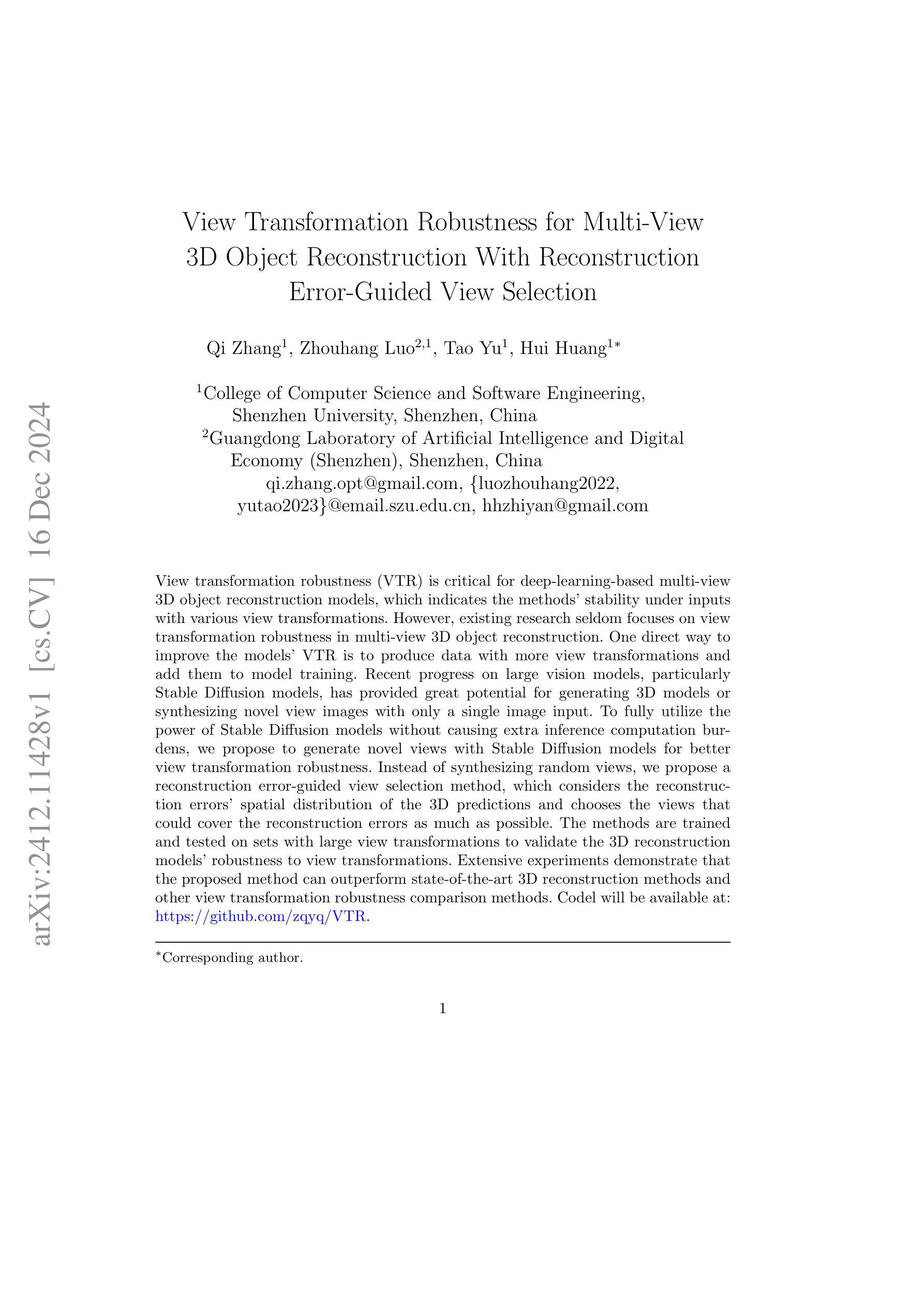 View transformation robustness (VTR) is critical for deep-learning-based multi-view 3D object reconstruction models, which indicates the methods’ stability under inputs with various view transformations. However, existing research seldom focused on view transformation robustness in multi-view 3D object reconstruction. One direct way to improve the models’ VTR is to produce data with more view transformations and add them to model training. Recent progress on large vision models, particularly Stable Diffusion models, has provided great potential for generating 3D models or synthesizing novel view images with only a single image input. Directly deploying these models at inference consumes heavy computation resources and their robustness to view transformations is not guaranteed either. To fully utilize the power of Stable Diffusion models without extra inference computation burdens, we propose to generate novel views with Stable Diffusion models for better view transformation robustness. Instead of synthesizing random views, we propose a reconstruction error-guided view selection method, which considers the reconstruction errors’ spatial distribution of the 3D predictions and chooses the views that could cover the reconstruction errors as much as possible. The methods are trained and tested on sets with large view transformations to validate the 3D reconstruction models’ robustness to view transformations. Extensive experiments demonstrate that the proposed method can outperform state-of-the-art 3D reconstruction methods and other view transformation robustness comparison methods. Code is available at: https://github.com/zqyq/VTR.