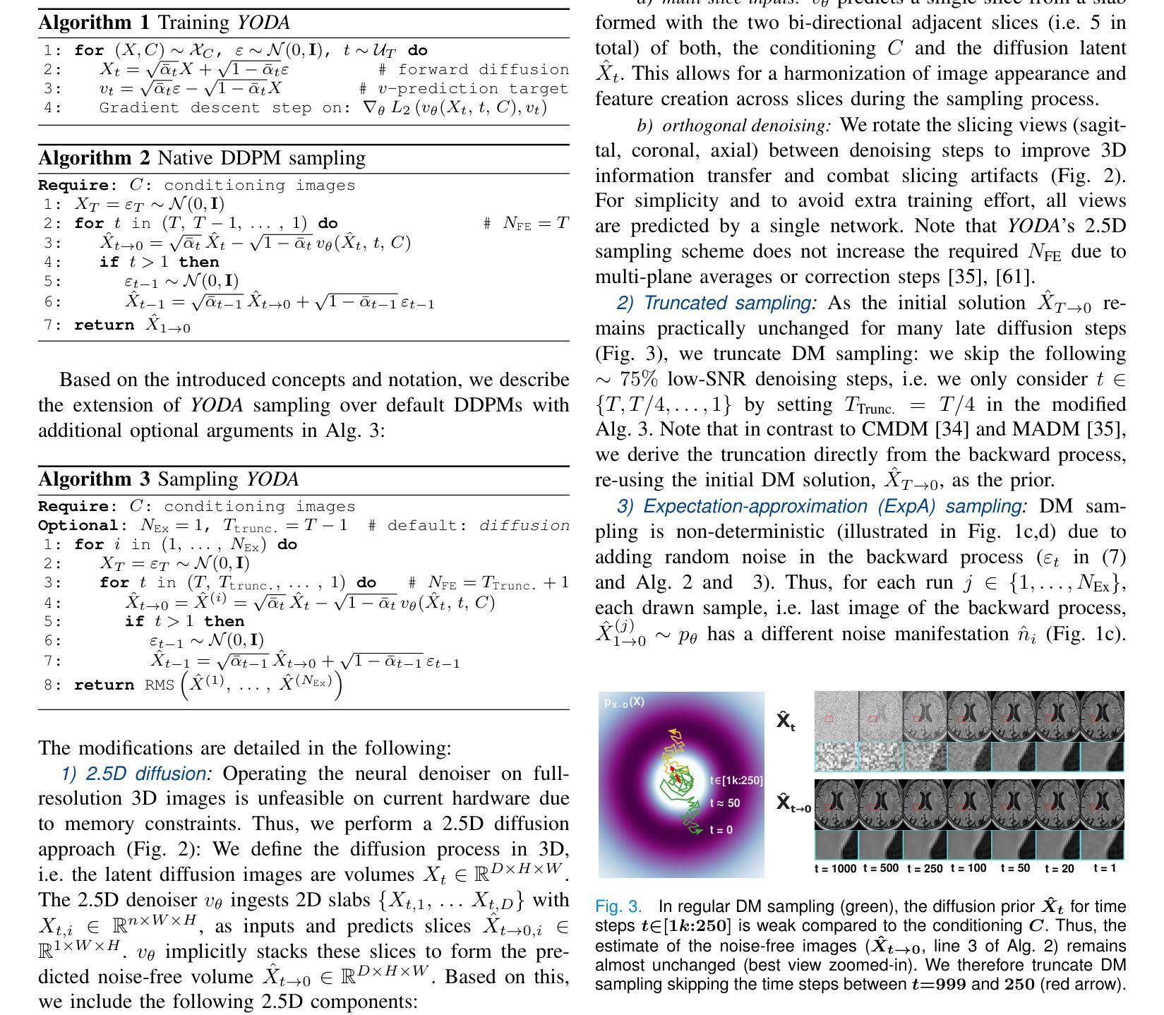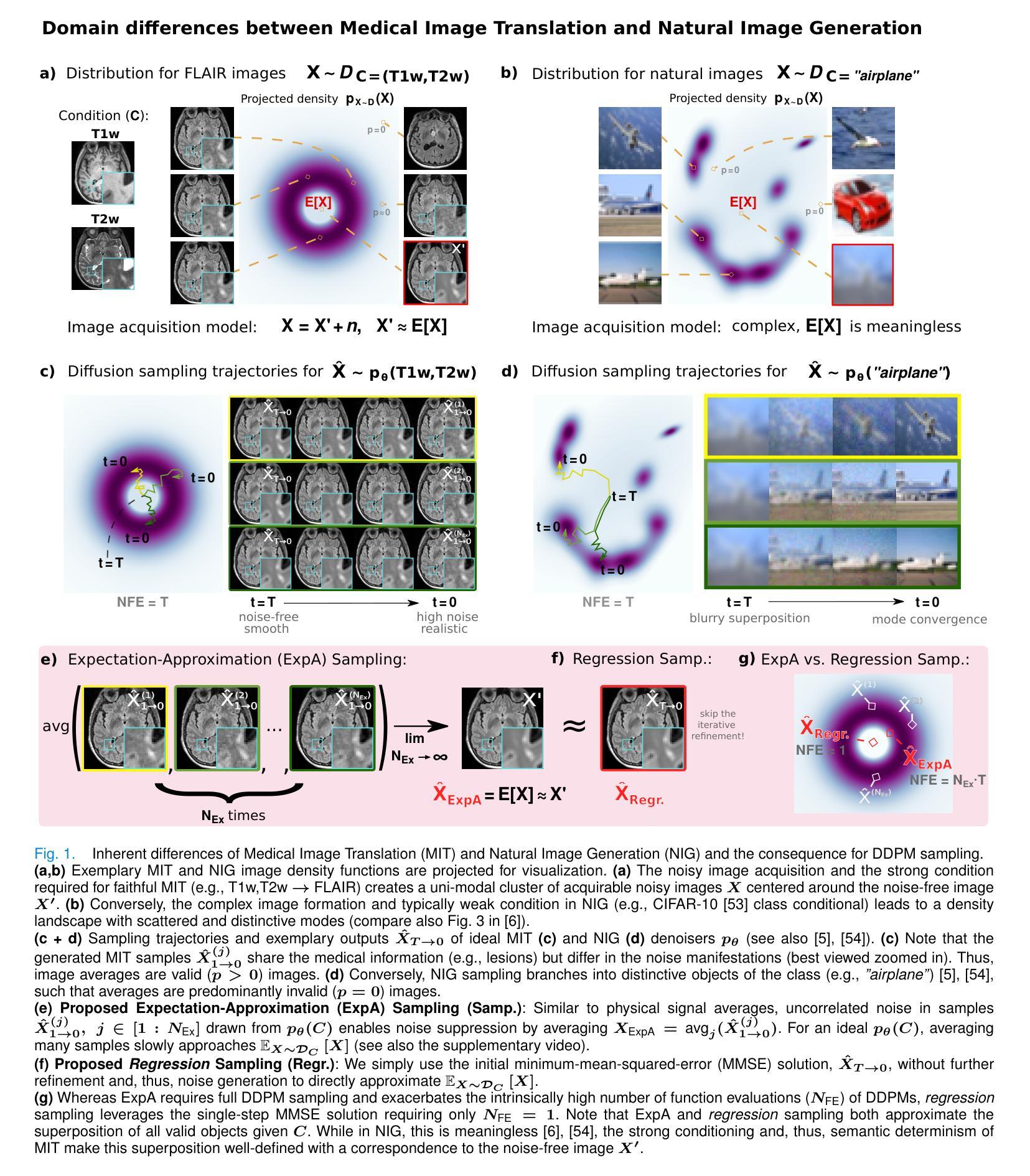 虽然生成对抗网络(GANs)和扩散模型(DMs)在自然图像合成方面取得了令人印象深刻的结果,但它们在医学应用中的核心优势——创造性和逼真性——可能是有害的,因为准确性和保真性在医学应用中至关重要。这些模型反而可能引入幻觉和复制不需要的采集噪声。在这里,我们提出YODA(You Only Denoise once - or Average,意为“你只去噪一次或平均”),这是一个基于扩散的医学图像翻译(MIT)的2.5D框架。符合DM理论,我们发现传统的扩散采样会随机复制噪声。为了缓解这个问题,我们绘制并平均多个样本,类似于物理信号平均。由于这有效地近似了DM的期望值,我们将这种采样称为期望值近似(ExpA)采样。此外,我们提出了回归采样YODA,它保留了初始的DM预测值,并省略了迭代细化,以单步生成无噪声图像。在五个多样化的多模式数据集上——包括多对比度脑部MRI和盆腔MRI-CT——我们证明回归采样不仅效率更高,而且即使使用ExpA,其图像质量也与全扩散采样相匹配或更高。我们的结果表明,迭代细化只是提高了感知的真实性,而对信息翻译没有帮助,这一点在我们相关的下游任务中也得到了证实。YODA的表现优于八种最先进的DMs和GANs,并对DMs和GANs在计算成本较低的回归模型上进行高质量MIT的假定优越性提出了挑战。此外,我们还表明YODA翻译的图像可以与物理采集互换,甚至在某些医学应用中表现更好。