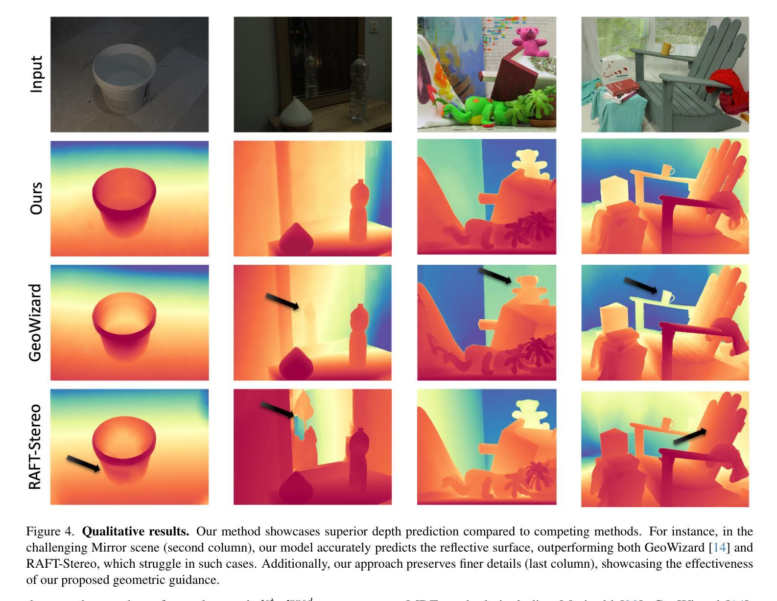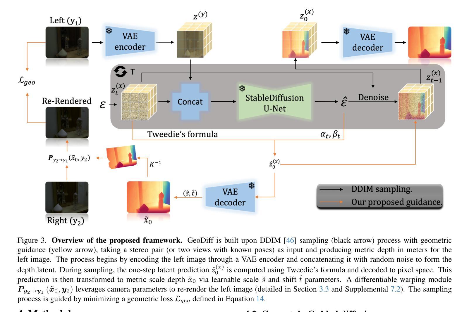 - 利用预训练的潜在扩散模型并结合立体几何约束,用于学习尺度和偏移量,以实现准确的深度恢复。