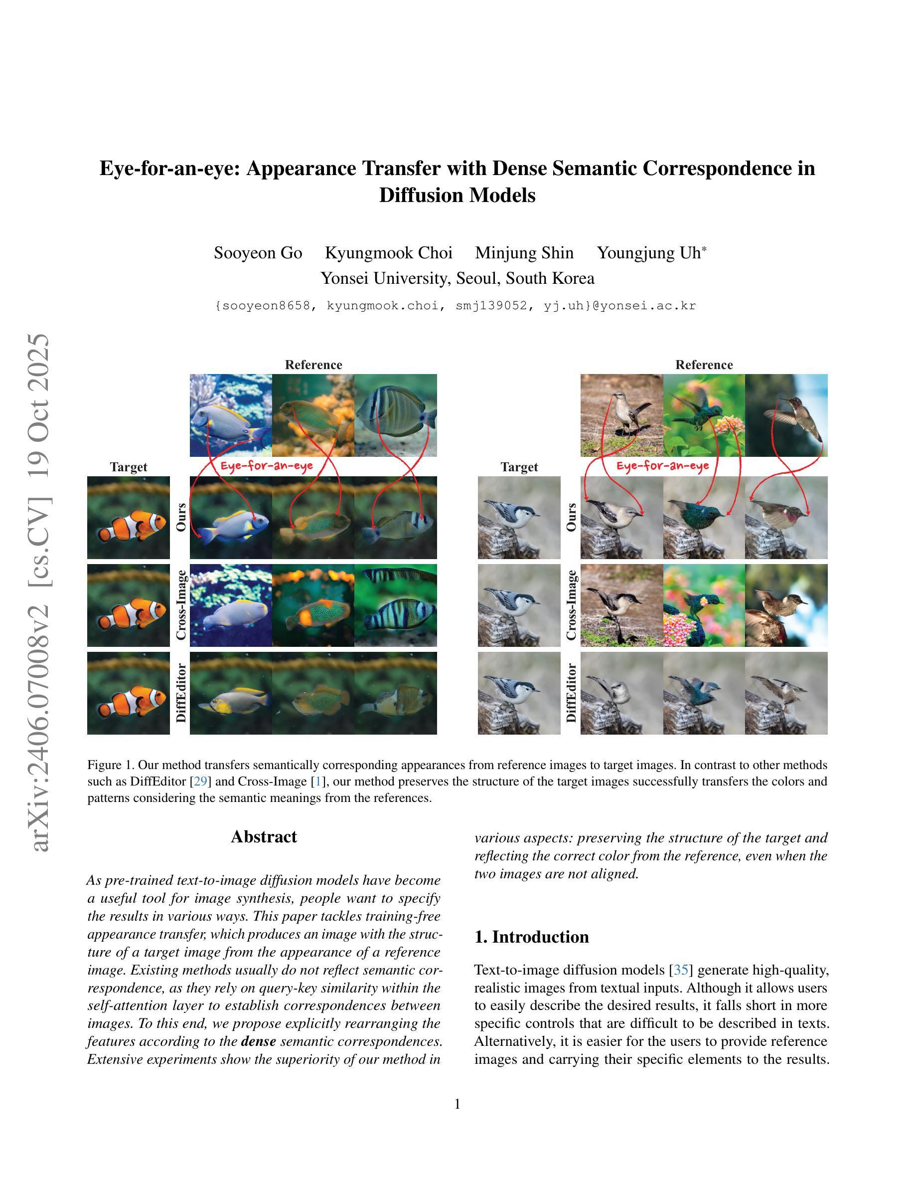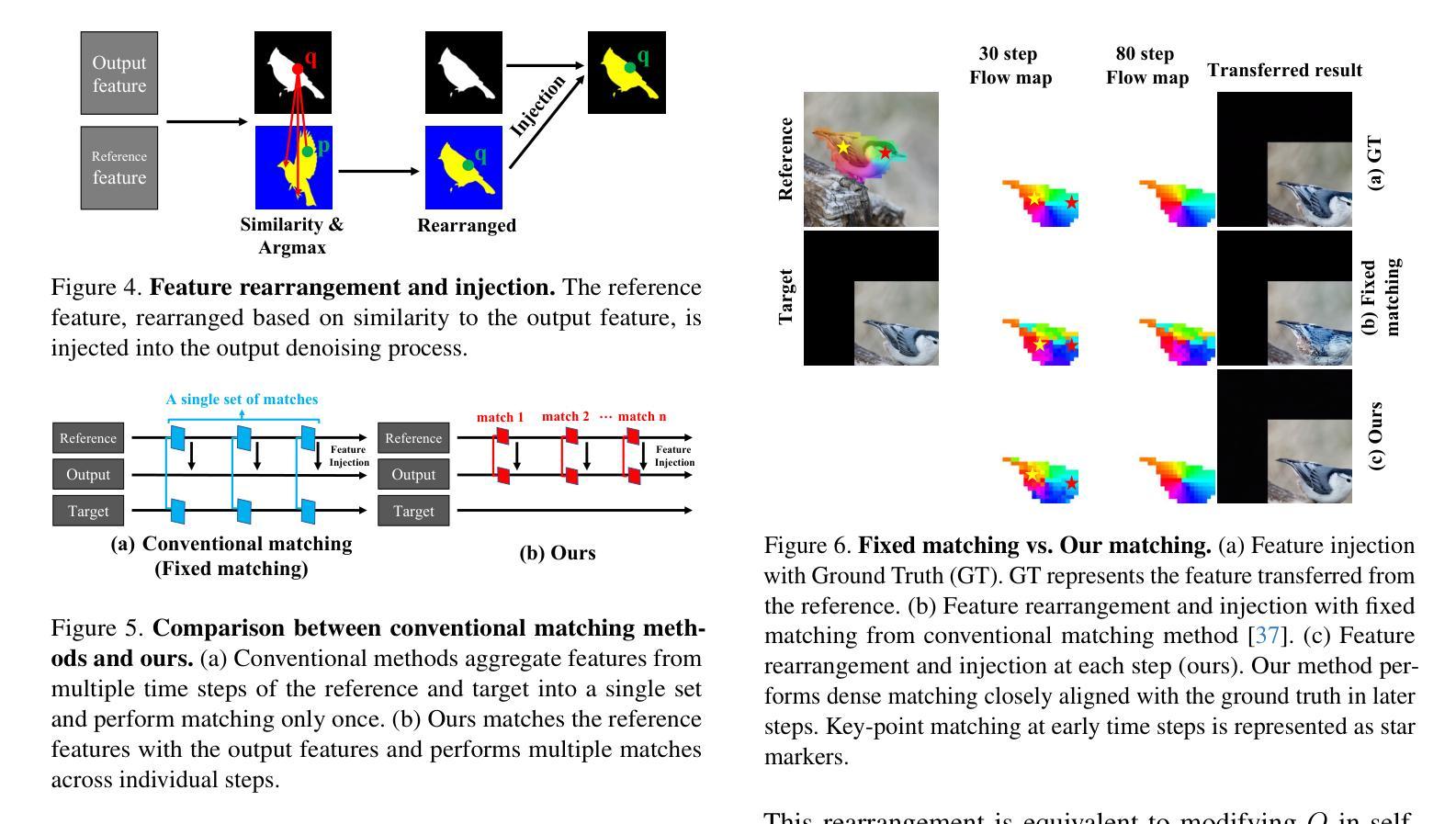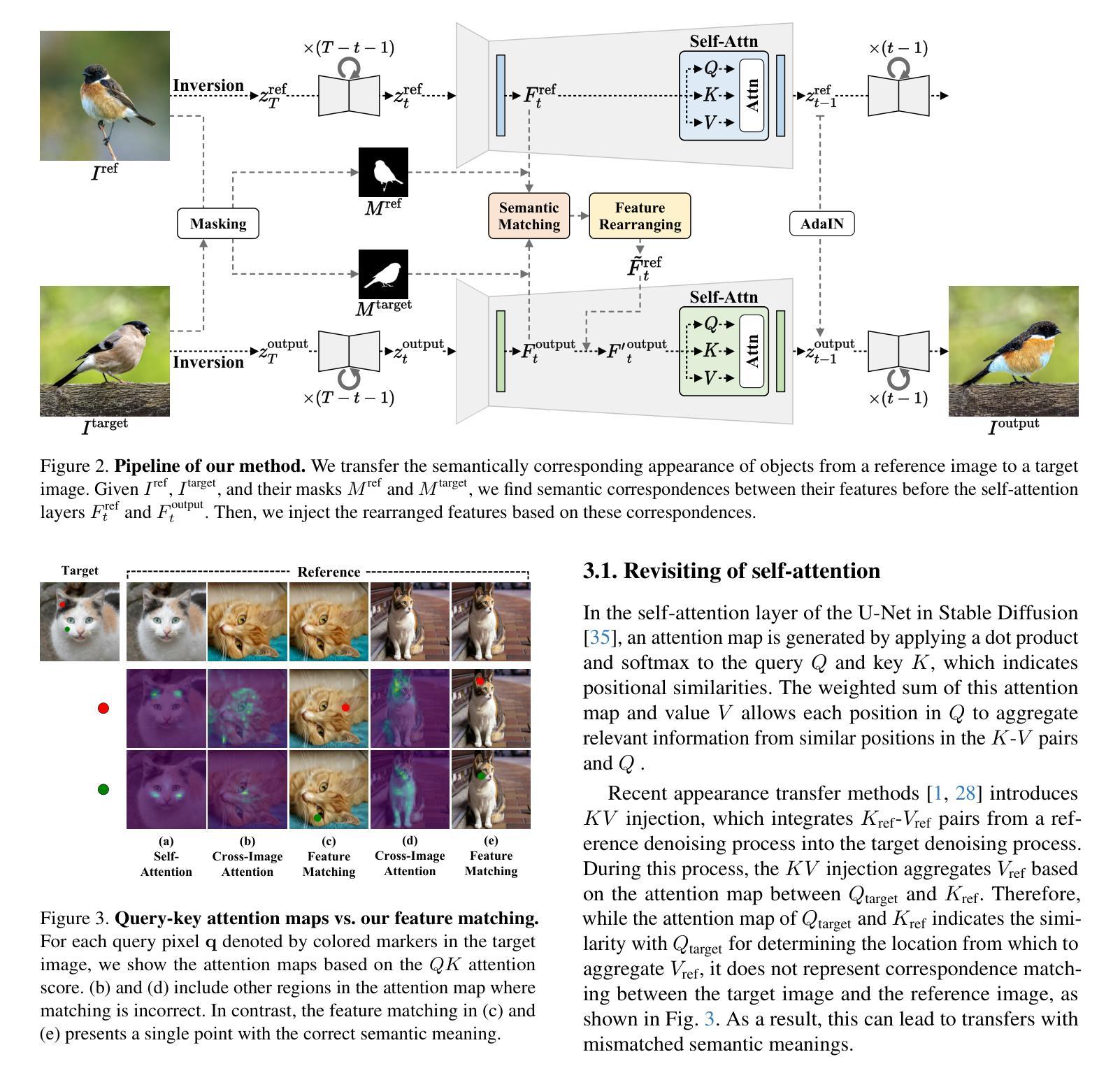 随着预训练的文本到图像扩散模型成为图像合成的有用工具,人们希望能够以各种方式指定结果。本文解决无训练外观转移问题,它利用参考图像的外观生成具有目标图像结构的图像。现有方法通常不反映语义对应关系,因为它们依赖于自注意力层内的查询-键相似性来建立图像之间的对应关系。为此,我们提出根据密集的语义对应关系重新排列特征。大量实验表明,我们的方法在各个方面都具有优越性:能够保留目标的结构并从参考图像反映正确的颜色,即使两个图像未对齐。
