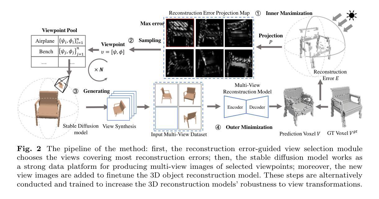 视图变换稳健性(VTR)对于基于深度学习的多视图3D对象重建模型至关重要,它反映了方法在处理具有各种视图变换的输入时的稳定性。然而,现有的研究很少关注多视图3D对象重建中的视图变换稳健性。提高模型的VTR的一种直接方法是生成更多具有视图变换的数据并将其添加到模型训练中。最近的大型视觉模型的进展,特别是Stable Diffusion模型,为仅使用单张图像输入生成3D模型或合成新型视图图像提供了巨大潜力。直接在推理阶段部署这些模型会消耗大量的计算资源,而且它们对视图变换的稳健性也无法保证。为了充分利用Stable Diffusion模型的潜力,而无需额外的推理计算负担,我们提出使用Stable Diffusion模型生成新型视图,以提高视图变换的稳健性。我们不是合成随机视图,而是提出了一种重建误差引导下的视图选择方法,该方法考虑了3D预测重建误差的空间分布,并选择了能够尽可能覆盖重建误差的视图。这些方法是在具有大视图变换的集合上进行训练和测试的,以验证3D重建模型对视图变换的稳健性。大量实验表明,所提出的方法能够超越最先进的3D重建方法和其他视图变换稳健性对比方法。代码可用:https://github.com/zqyq