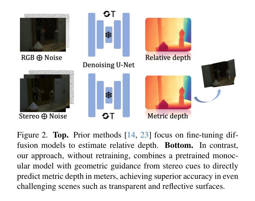 基于扩散模型的新框架通过结合立体视觉指导增强了对单眼深度估计模型的训练,针对基于深度图像的恢复问题提出了解决方案。现有方法主要预测相对深度,而绝对深度估计仍面临挑战,原因在于单图像场景中的尺度模糊问题。该研究将深度估计重新定义为逆问题,利用基于RGB图像的预训练潜在扩散模型结合立体几何约束来学习尺度和偏移量,以实现准确深度恢复。该研究提出的无训练解决方案无缝集成现有框架,并在室内、室外和复杂环境中表现出色。实验表明,该研究的方法在具有挑战性的透明和镜面表面场景中与最新技术方法相比具有相当或更好的性能,并且无需重新训练。