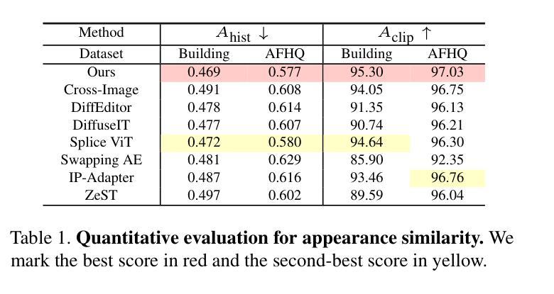本文介绍了一种无需训练的外观转移方法,该方法可以利用目标图像的结构和参考图像的外观来生成图像。通过显式地根据密集语义对应关系重新排列特征,实现了不同图像间的有效映射,且能很好地保留目标图像的结构并从参考图像反映正确的颜色,即使两个图像未对齐也能实现这一效果。