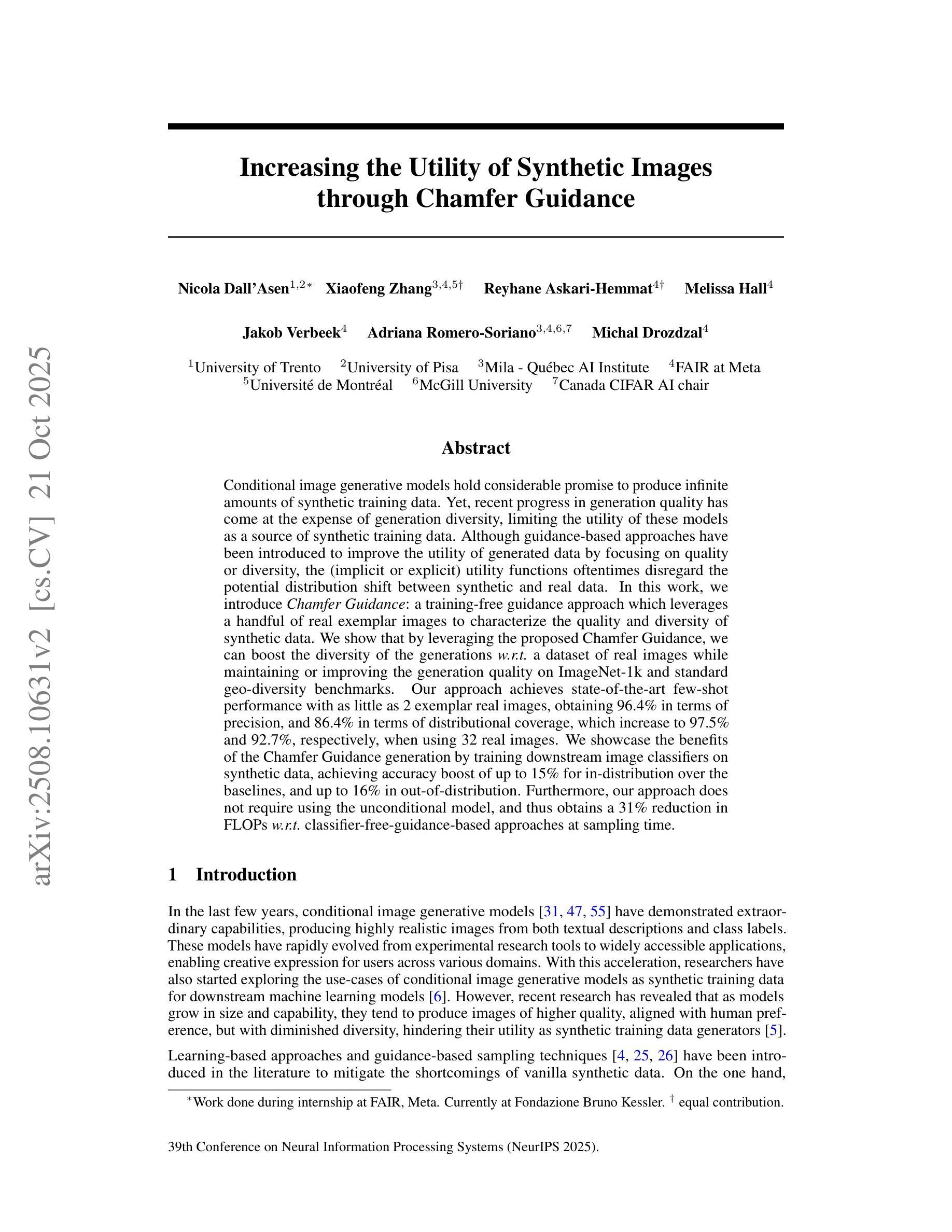 条件图像生成模型具有产生无限合成训练数据的巨大潜力。然而,生成质量方面的最新进展却是以牺牲生成多样性为代价的,这限制了这些模型作为合成训练数据源的有效性。虽然基于引导的方法已经被引入,通过关注质量或多样性来提高生成数据的有效性,但(隐式或显式)效用函数通常忽略了合成数据和真实数据之间潜在的分发转移。在这项工作中,我们引入了Chamfer Guidance:一种无需训练的引导方法,它利用少量真实示例图像来表征合成数据的质量和多样性。我们表明,通过利用提出的Chamfer Guidance,我们可以在面对真实图像数据集时提高生成的多样性,同时在ImageNet-1k和标准地理多样性基准测试上保持或提高生成质量。我们的方法仅需几张真实示例图像即可实现最先进的少量性能,在精确度为96.4%和数据分布覆盖率为86.4%的情况下取得领先地位,在使用32张真实图像时,这些数字分别提高到97.5%和92.7%。我们通过训练合成数据上的下游图像分类器来展示Chamfer Guidance生成的优势,在内部和外部数据分布方面分别实现了最多高达15%和高达16%的准确度提升。此外,我们的方法不需要使用无条件模型,因此在采样时间方面与使用无分类引导法的方法相比,实现了高达31%的浮点运算减少。