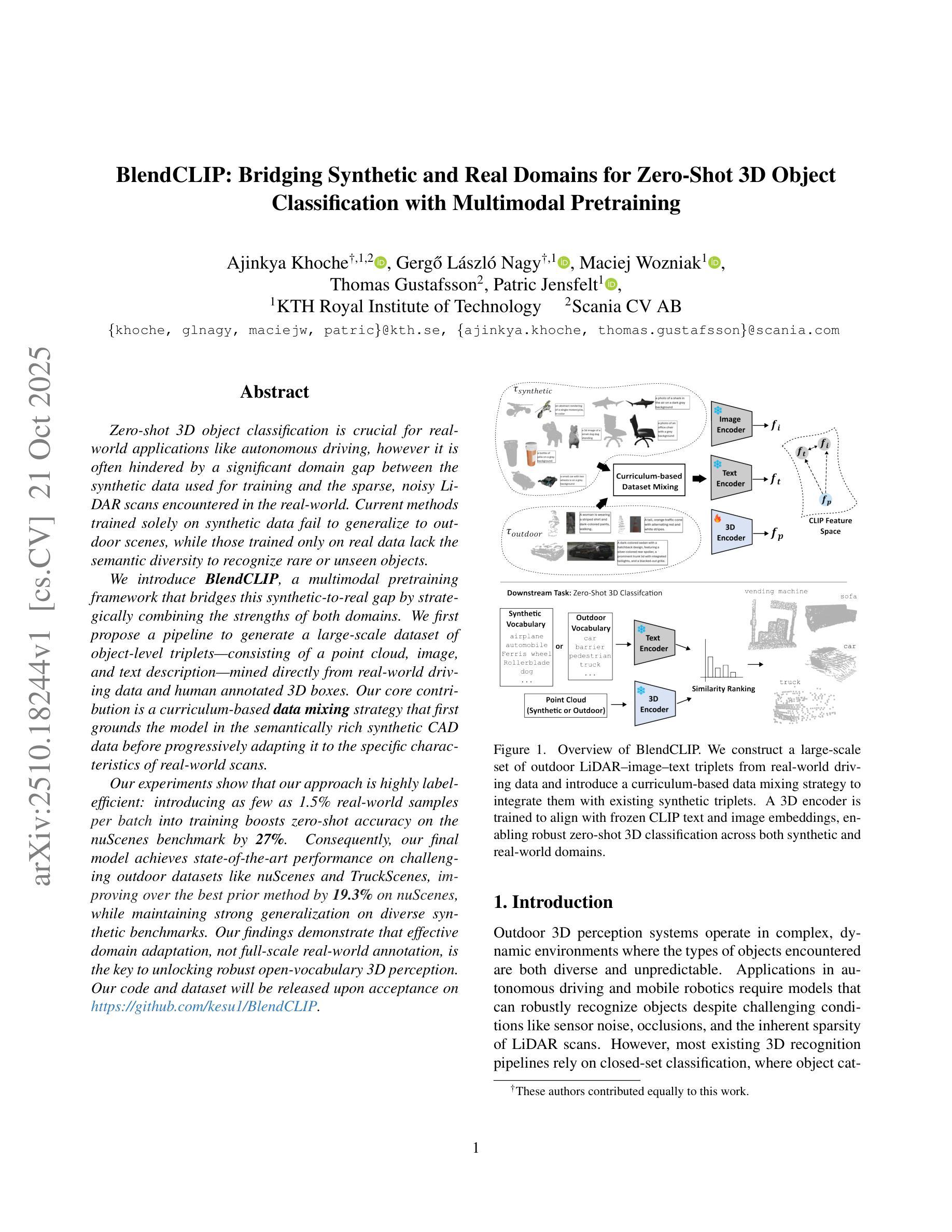 零样本3D目标分类对于自动驾驶等实际应用至关重要,然而它常常受到训练时使用的合成数据与现实中稀疏、嘈杂的激光雷达扫描之间存在的巨大领域差距的阻碍。当前仅依赖合成数据训练的方法无法推广到室外场景,而仅依赖真实数据训练的方法则缺乏语义多样性,无法识别稀有或未见过的目标。我们引入了BlendCLIP,这是一个多模态预训练框架,它通过结合两个领域的优势来缩小合成与真实之间的差距。我们首先提出一个流程来生成大规模的目标级三元组数据集,该数据集由直接从现实世界驾驶数据中挖掘出的点云、图像和文本描述组成,以及人工标注的3D框。我们的核心贡献是基于课程的数据混合策略,该策略首先使模型基于语义丰富的合成CAD数据,然后逐步适应现实扫描的特定特征。我们的实验表明,我们的方法非常高效:每批仅引入1.5%的真实世界样本即可提高nuScenes基准测试上的零样本准确率27%。因此,我们的最终模型在具有挑战性的室外数据集(如nuScenes和TruckScenes)上实现了最先进的性能,在nuScenes上的表现比最佳先前方法提高了19.3%,同时在各种合成基准测试中保持强大的泛化能力。我们的代码和数据集将在验收后发布在https://github.com/kesu1/BlendCLIP上。