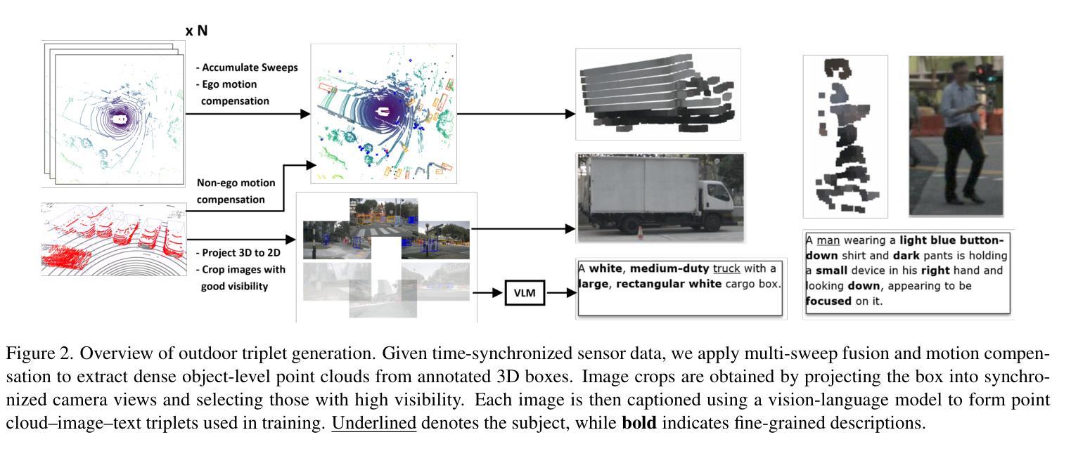 - 该方法结合生成大规模的对象级三元组数据集,包括点云、图像和文本描述,挖掘自真实世界驾驶数据和人标注的三维框。