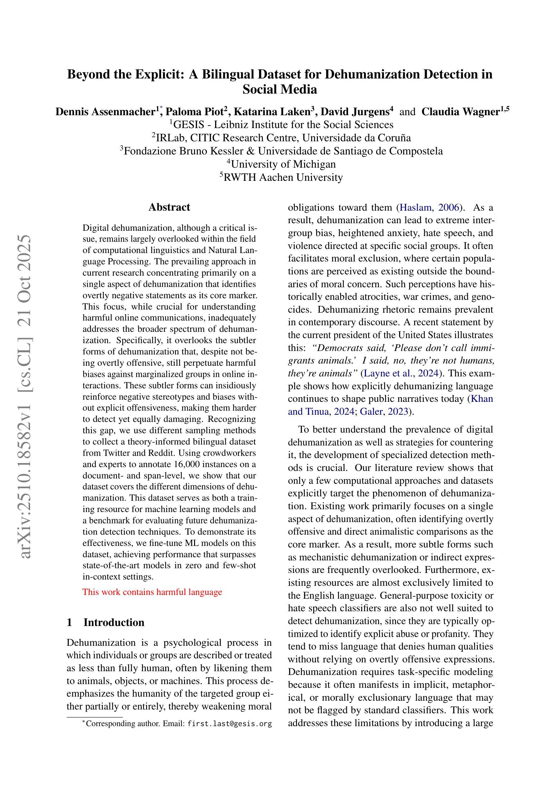 数字化非人性化虽然是一个关键问题,但在计算语言学和自然语言处理领域仍然被忽视。当前的研究方法主要集中在非人性化的一个方面,即以明显的负面言论为核心标志。这种关注虽然对于理解有害的在线交流至关重要,但不足以涵盖更广泛的非人性化现象。具体来说,它会忽视更微妙的非人性化形式,这些形式虽然没有明显的攻击性,但仍然会在在线互动中对边缘群体造成有害的偏见。这些微妙的偏见形式可以在没有明显攻击性的情况下暗中强化负面刻板印象和偏见,使其更难检测但同样具有破坏性。认识到了这一差距,我们使用不同的采样方法从Twitter和Reddit上收集了一个理论上的双语数据集。我们利用众包工人和专家在文档和跨度层面标注了16000个实例,证明了我们的数据集涵盖了非人性化的不同维度。这个数据集既是训练机器学习模型的资源,也是评估未来非人性化检测技术的基准。为了证明其有效性,我们在该数据集上微调了机器学习模型,实现了在零次和少次情境下的性能超越现有最先进的模型。