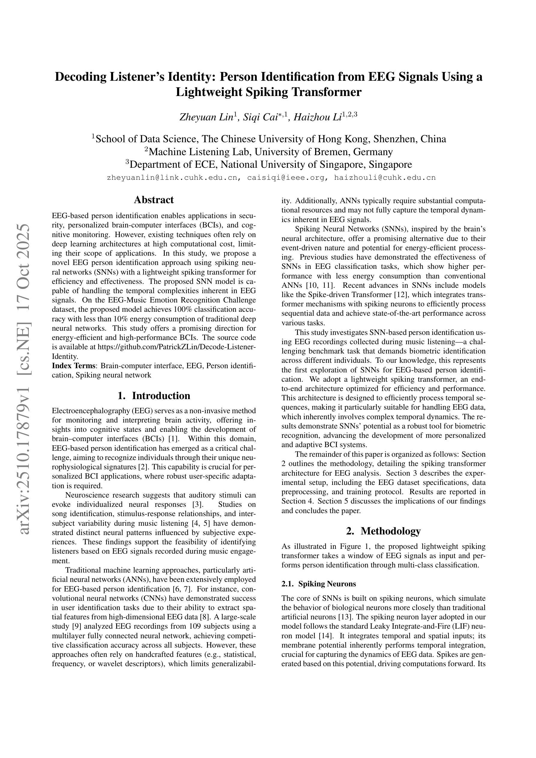 基于脑电图(EEG)的人员识别技术为安全、个性化脑机接口(BCI)和认知监控等领域的应用提供了可能。然而,现有技术通常依赖于高计算成本的深度学习架构,限制了其应用范围。在这项研究中,我们提出了一种使用脉冲神经网络(SNN)的新型EEG人员识别方法,并配备了一个轻量级的脉冲变压器以提高效率和效果。所提出的SNN模型能够处理EEG信号固有的时间复杂性。在EEG音乐情绪识别挑战赛数据集上,该模型实现了高达百分之百的分类准确率,同时其能源消耗仅为传统深度神经网络的不到十分之一。本研究为能源高效和高性能的BCI提供了一个有前途的研究方向。源代码可在https://github.com/PatrickZLin/Decode-ListenerIdentity找到。