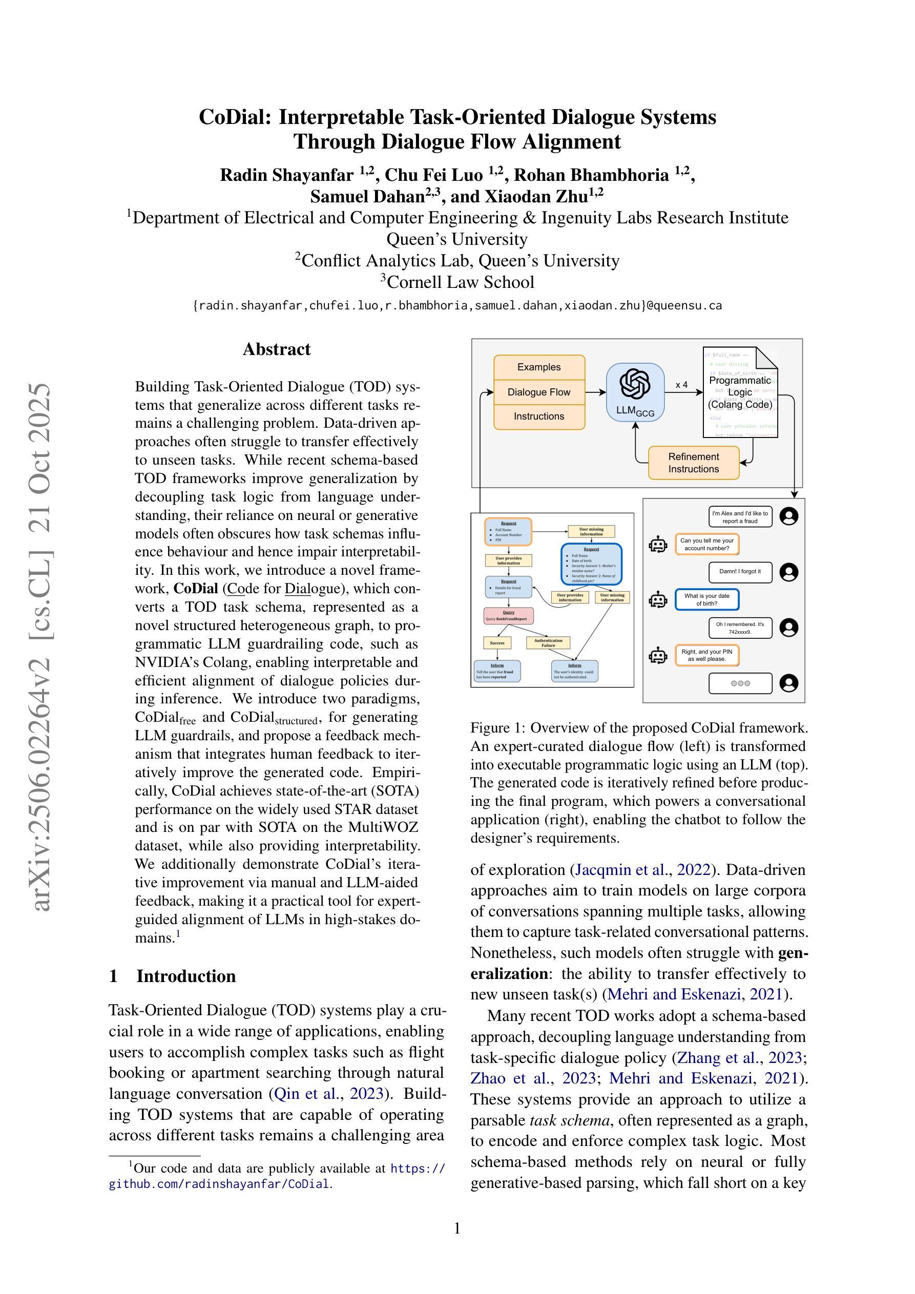 构建能够跨不同任务进行泛化的任务型对话(TOD)系统仍然是一个具有挑战性的问题。数据驱动的方法通常难以有效地转移到未见过的任务。虽然最近的基于模式的TOD框架通过解耦任务逻辑与语言理解来改进泛化性能,但它们对神经网络或生成模型的依赖往往会掩盖模式如何影响行为,从而损害了解释性。在这项工作中,我们引入了一个新型框架CoDial(对话代码),它将TOD任务模式转换为程序化LLM防护代码,例如NVIDIA的Colang,从而在推理过程中实现可解释和高效的对话策略对齐。我们介绍了两种生成LLM防护栏的模式,即$\text{CoDial}{\text{free}}$和$\text{CoDial}{\text{structured}}$,并提出了一种反馈机制,该机制可以整合人类反馈来迭代改进生成的代码。经验上,CoDial在广泛使用的STAR数据集上达到了最新技术水平,并在MultiWOZ数据集上表现相当,同时还提供了可解释性。此外,我们还通过手动和LLM辅助反馈展示了CoDial的迭代改进,使其成为专家指导LLM对齐的高风险领域的实用工具。