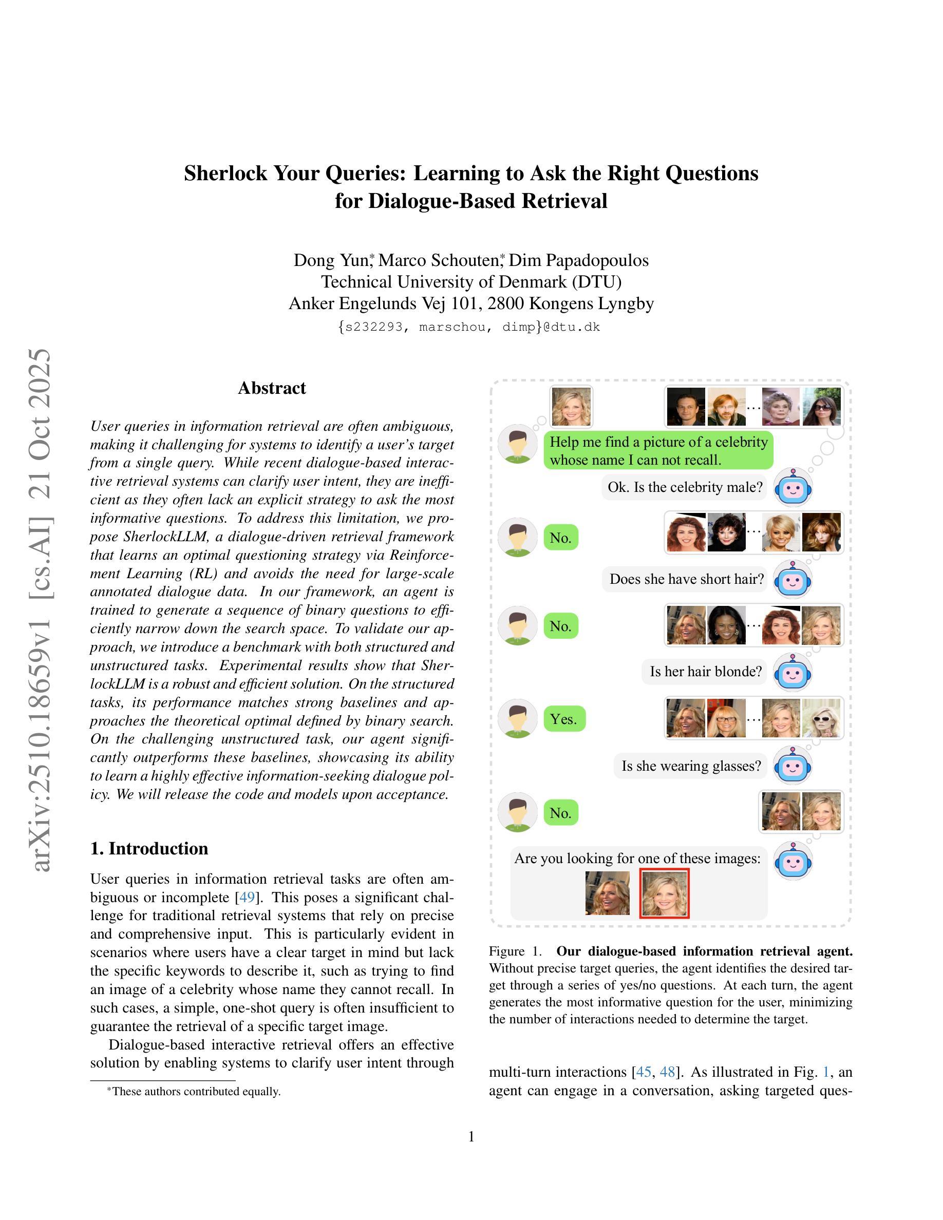 用户在信息检索中的查询往往是模糊的,这使得系统很难从单个查询中识别用户的意图。虽然最近基于对话的交互式检索系统可以澄清用户意图,但它们缺乏明确的策略来提出最具信息性的问题,因此效率不高。为了解决这一局限性,我们提出了SherlockLLM,这是一个对话驱动的检索框架,它通过强化学习(RL)学习最佳提问策略,无需大规模注释对话数据。在我们的框架中,代理经过训练,能够生成一系列二进制问题,以有效地缩小搜索范围。为了验证我们的方法,我们引入了包含结构化和非结构化任务的基准测试。实验结果表明,SherlockLLM是一种稳健高效的解决方案。在结构化任务上,其性能与强大的基线相匹配,接近由二进制搜索定义的理论最优。而在具有挑战性的非结构化任务上,我们的代理显著优于这些基线,展示了其学习高效的信息搜索对话策略的能力。