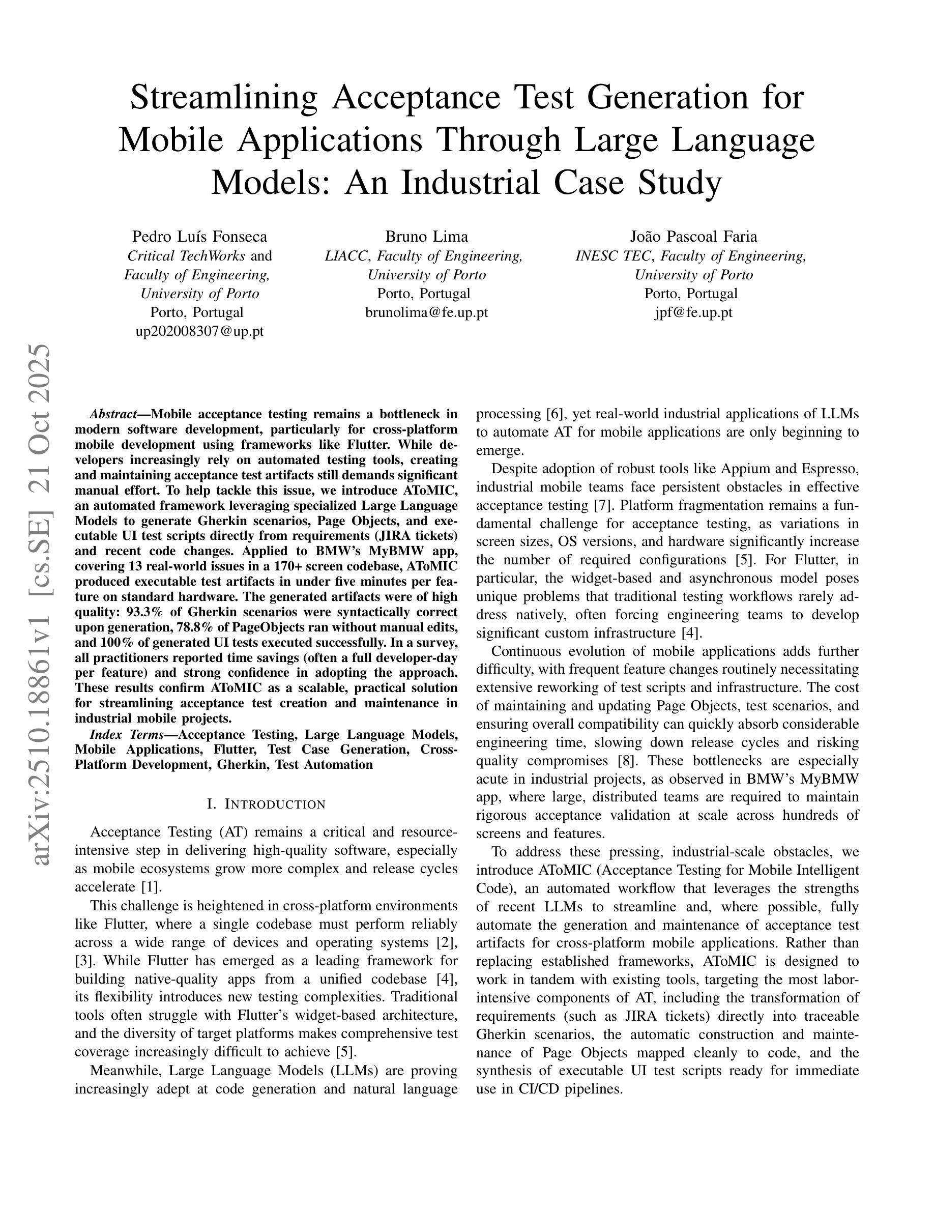 移动验收测试仍是现代软件开发中的瓶颈,特别是在使用Flutter等框架进行跨平台移动开发时。虽然开发者越来越依赖自动化测试工具,但创建和维护验收测试工件仍然需要巨大的手动努力。为了解决这一问题,我们引入了AToMIC,这是一个利用专业的大型语言模型自动化生成Gherkin场景、页面对象和可执行UI测试脚本的框架,这些脚本可以直接从需求(JIRA票据)和最近的代码更改中生成。在宝马的MyBMW应用上应用此框架,覆盖了一个拥有超过170个屏幕代码库的13个真实问题,AToMIC在标准硬件上每个功能生成可执行测试工件的时间不到五分钟。生成的工件质量很高:生成的Gherkin场景中语法正确率高达93.3%,无需手动编辑即可运行的页面对象占78.8%,生成的UI测试全部成功执行。在调查中,所有从业者都报告了时间节省(通常每个功能可以节省一整天的开发时间)以及对采用这种方法的强烈信心。这些结果证实AToMIC是一个可扩展的实际解决方案,可以简化工业移动项目的验收测试创建和维护工作。