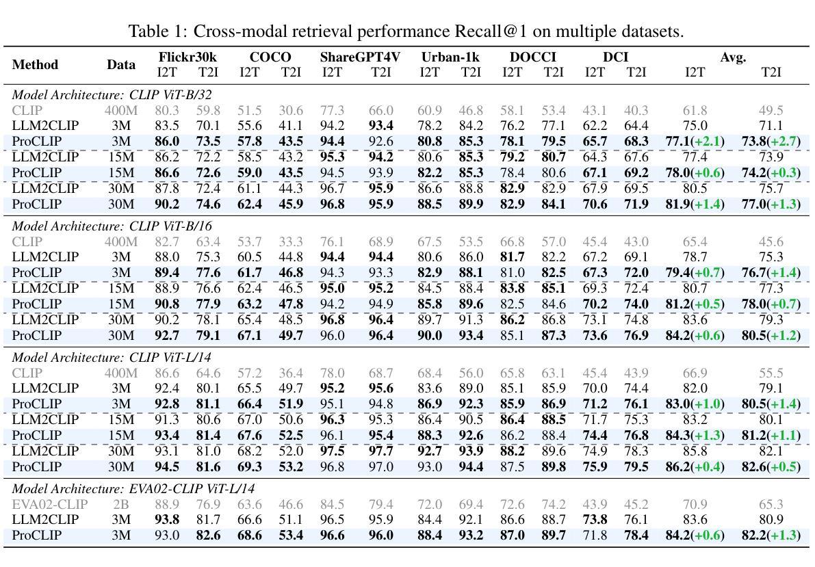 - ProCLIP利用实例语义对齐损失和嵌入结构对齐损失以实现更有效的模型对齐。