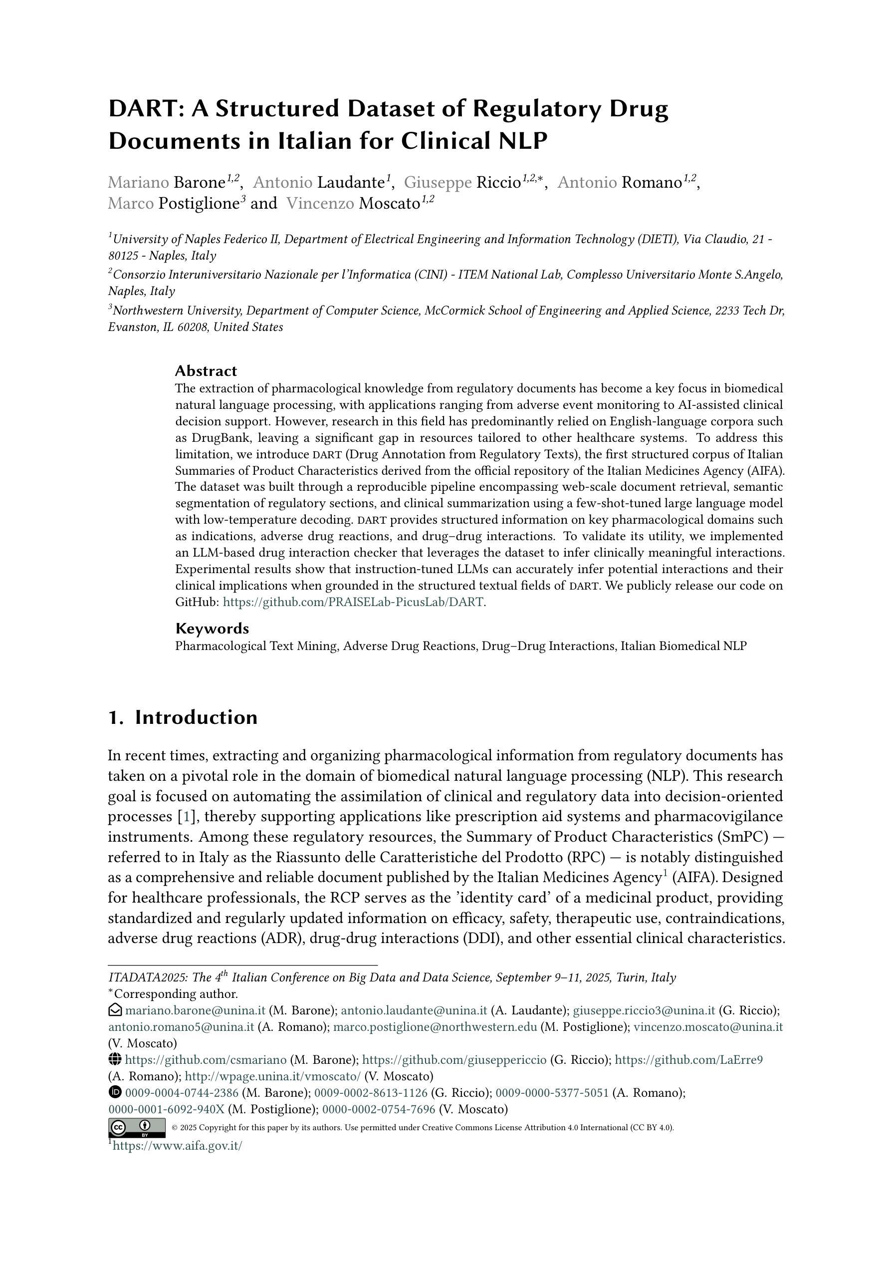 本文介绍了从监管文件中提取药理学知识的重要性,并指出当前研究主要依赖英语语料库,如DrugBank,忽视了其他医疗系统的资源需求。为解决这一问题,本文引入了DART(来自意大利药物管理局(AIFA)官方存储库的意大利产品特性摘要的结构化语料库)。该数据集通过可重复的管道构建,包括网页规模文档检索、监管部分的语义分割以及使用经过少量样本训练的大型语言模型进行临床总结。DART提供关于关键药理学领域的结构化信息,如适应症、药物不良反应和药物相互作用。为验证其实用性,本文实施了一个基于LLM的药物相互作用检查器,利用数据集推断具有临床意义的相互作用。实验结果表明,基于指令训练的LLM在DART的结构化文本字段中,能准确推断潜在的相互作用及其临床意义。