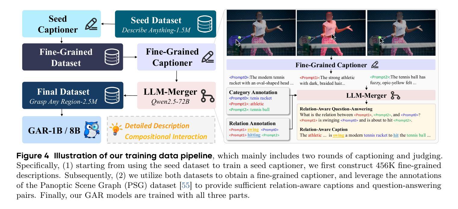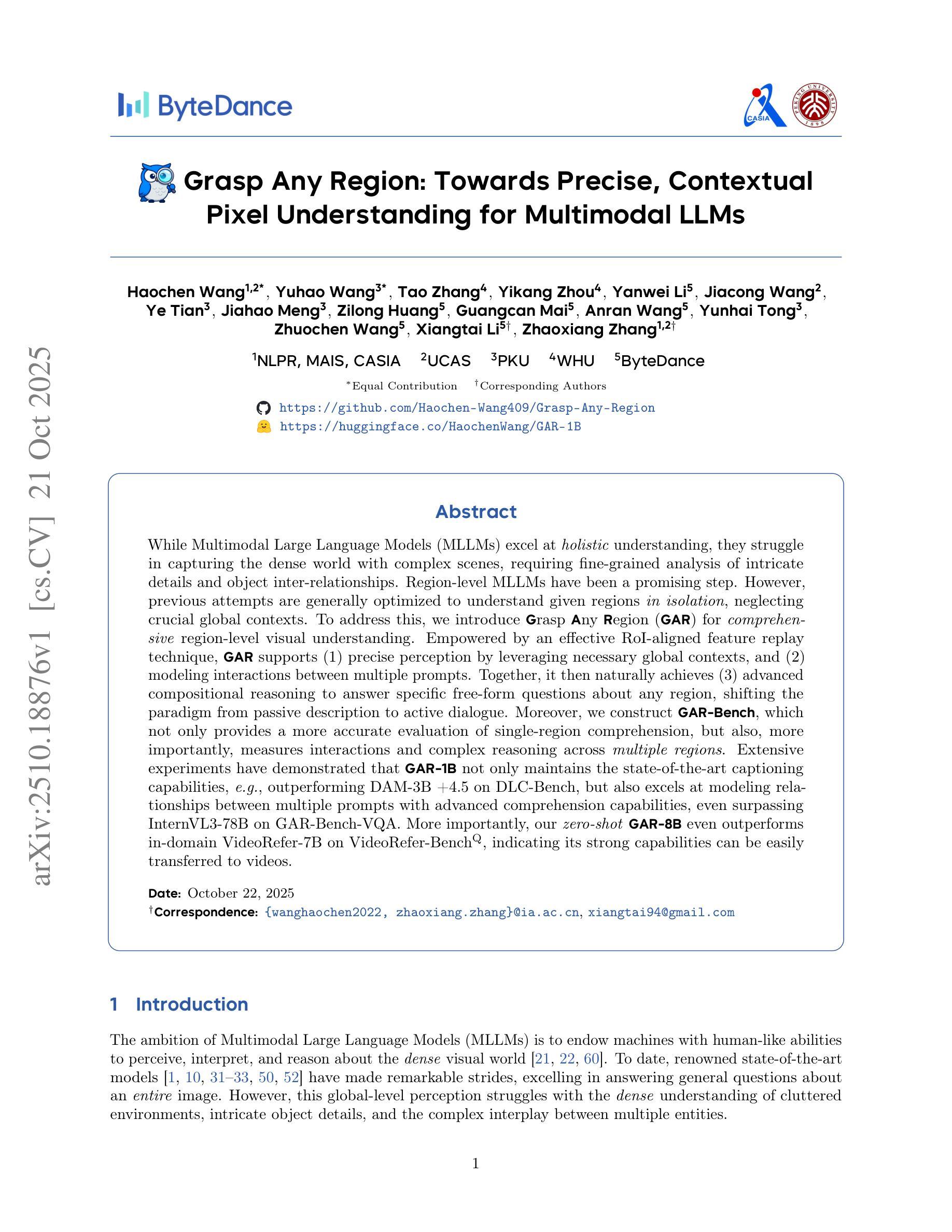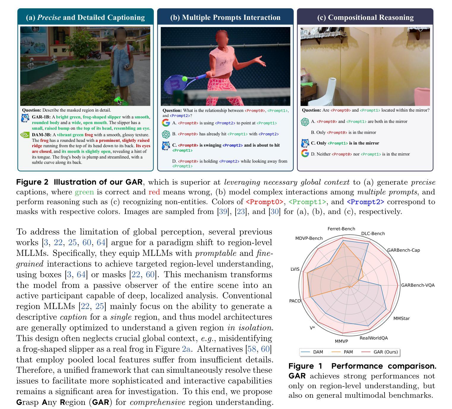 多模态大型语言模型(MLLMs)在整体理解方面表现出色,但在捕捉具有复杂场景的密集世界时遇到困难,需要精细分析复杂细节和对象之间的相互关系。区域级MLLMs是一个有希望的进步。然而,之前的尝试通常被优化为理解给定的孤立区域,忽略了重要的全局上下文。为了解决这一问题,我们引入了用于全面区域级视觉理解的Grasp Any Region(GAR)。通过有效的RoI对齐特征回放技术,GAR支持(1)利用必要全局上下文的精确感知,(2)对多个提示之间的交互进行建模。因此,它自然地实现了(3)先进的组合推理,可以回答有关任何区域的特定自由形式问题,从被动描述转向主动对话。此外,我们构建了GAR-Bench,它不仅可以更准确地评估单一区域的理解能力,而且更重要的是,还可以衡量多个区域之间的交互和复杂推理。大量实验表明,GAR-1B不仅保持了最先进的描述能力,例如在DLC-Bench上比DAM-3B高出4.5分,而且在建模多个提示之间的关系方面也表现出卓越的高级理解能力,甚至在GAR-Bench-VQA上超过了InternVL3-78B。更重要的是,我们的零启动GAR-8B甚至在VideoRefer-BenchQ上的表现优于领域内的VideoRefer-7B,这表明其强大能力可以轻松转移到视频领域。