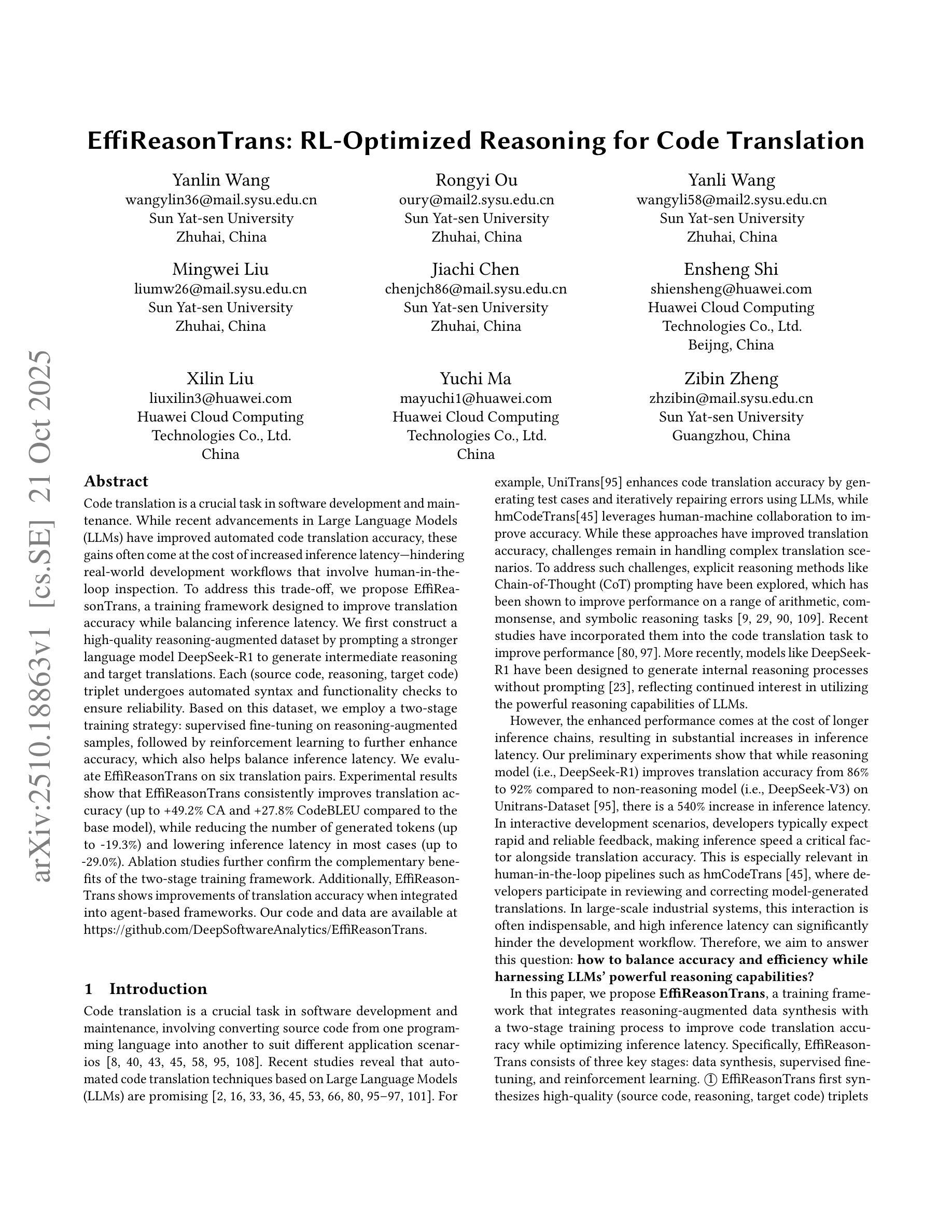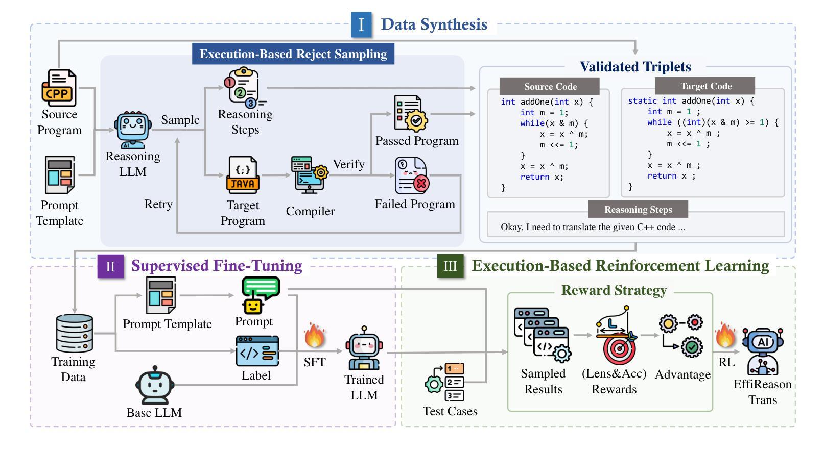 代码翻译是软件开发和维护中的一项重要任务。虽然最近的大型语言模型(LLM)的进步提高了自动代码翻译的准确度,但这些进步往往会导致推理延迟增加,阻碍了涉及人类循环检查的实际开发工作流程。为了解决这一权衡问题,我们提出了EffiReasonTrans,这是一个旨在提高翻译准确度同时平衡推理延迟的训练框架。我们首先通过提示更强大的语言模型DeepSeek-R1来构建高质量推理增强数据集,生成中间推理和目标翻译。每个(源代码、推理、目标代码)三元组都经过自动化的语法和功能性检查,以确保其可靠性。基于此数据集,我们采用两阶段训练策略:首先在推理增强样本上进行监督微调,然后采用强化学习进一步提高准确性和平衡推理延迟。我们在六个翻译对上评估了EffiReasonTrans。实验结果表明,它持续提高了翻译准确度(与基础模型相比,最高提升了+49.2% CA和+27.8% CodeBLEU),同时减少了生成的令牌数量(最多减少-19.3%),并在大多数情况下降低了推理延迟(最多降低-29.0%)。消融研究进一步证实了两阶段训练框架的互补优势。此外,当集成到基于代理的框架中时,EffiReasonTrans显示出更高的翻译准确度。我们的代码和数据可在https://github.com/DeepSoftwareAnalytics/EffiReasonTrans上获得。