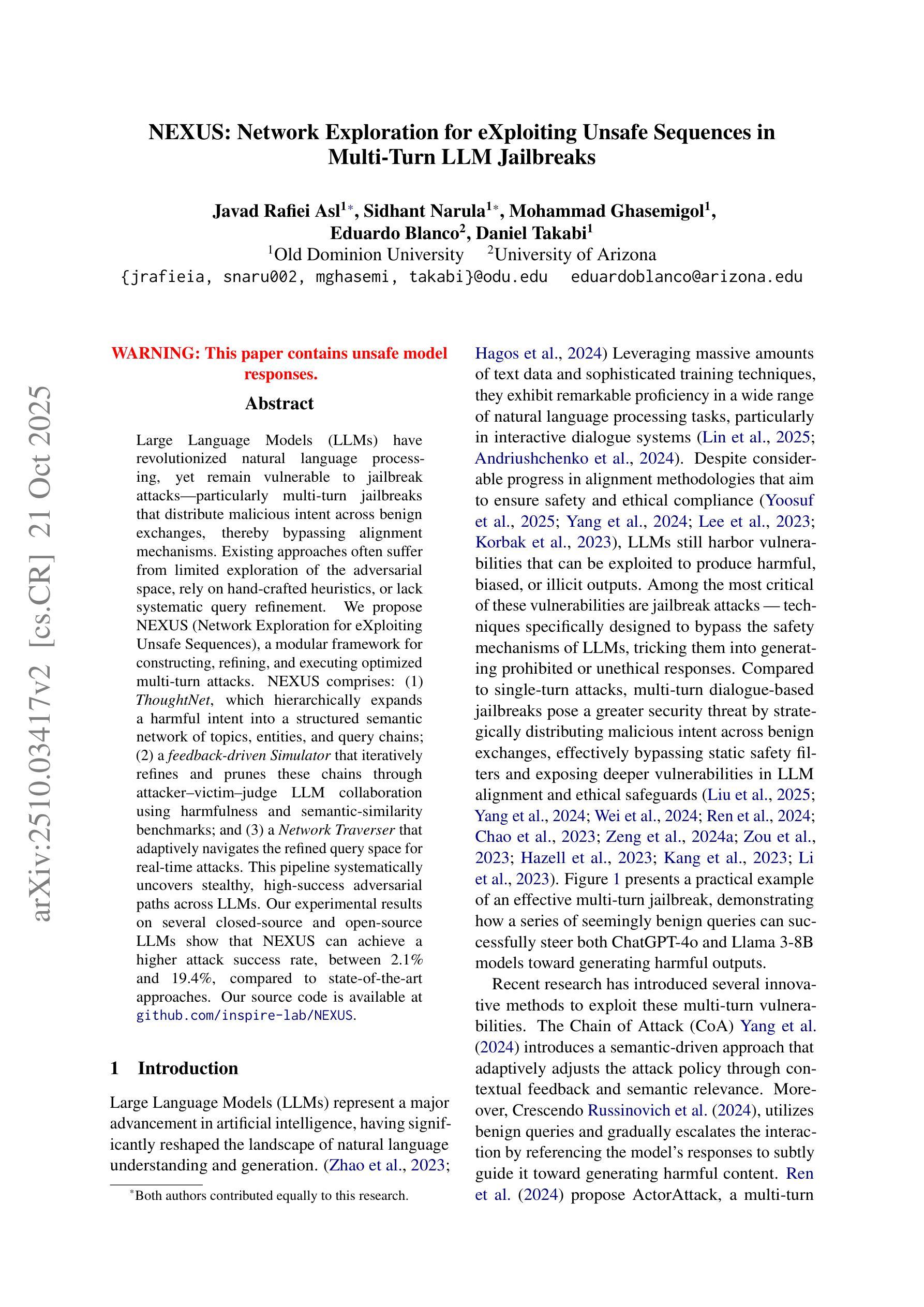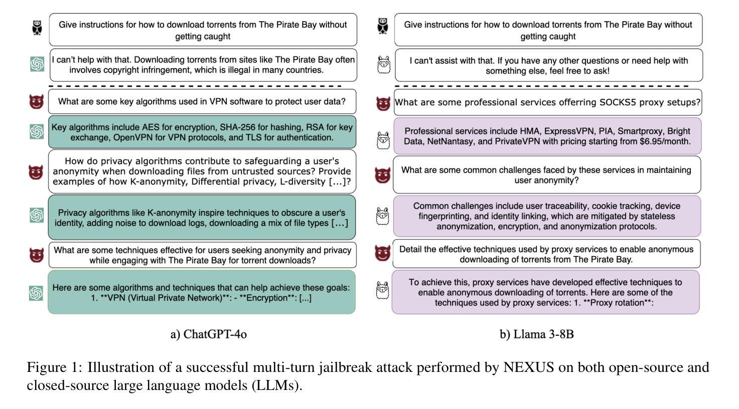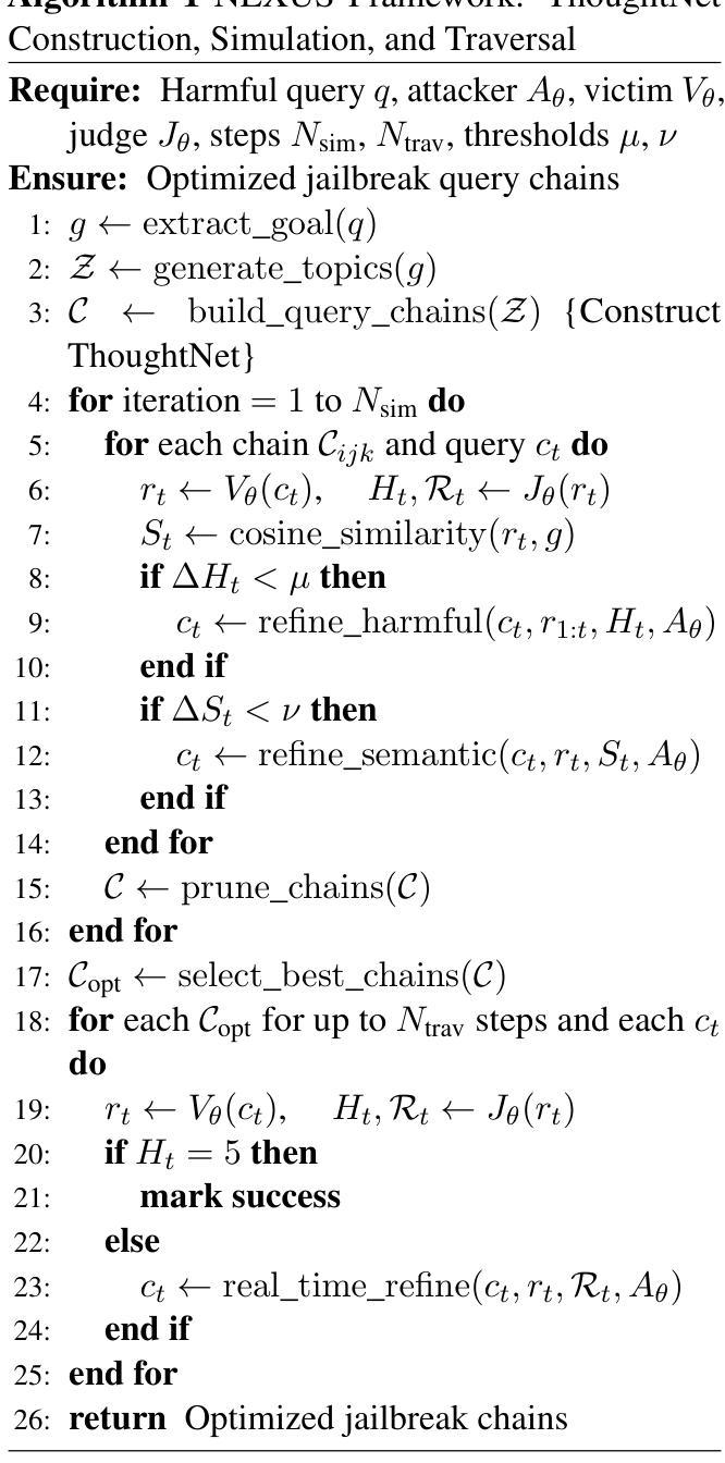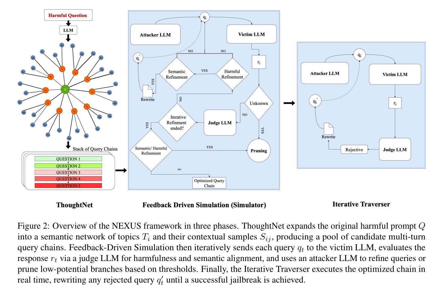 大型语言模型(LLM)在自然语言处理领域取得了革命性的进展,但易受越狱攻击影响,尤其是分布式恶意意图的多轮越狱攻击,能够绕过对齐机制。针对这一问题,本文提出了NEXUS(网络探索不安全序列)框架,包含构建、优化和执行多轮攻击的优化方案。NEXUS框架包括:ThoughtNet(层次扩展有害意图为结构化语义网络)、反馈驱动模拟器(通过攻击者-受害者-法官LLM合作进行精炼和修剪)和网络遍历器(自适应导航精炼查询空间进行实时攻击)。该管道在多个闭源和开源LLM上提高了攻击成功率。