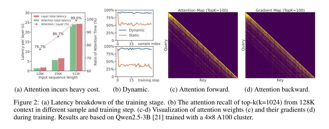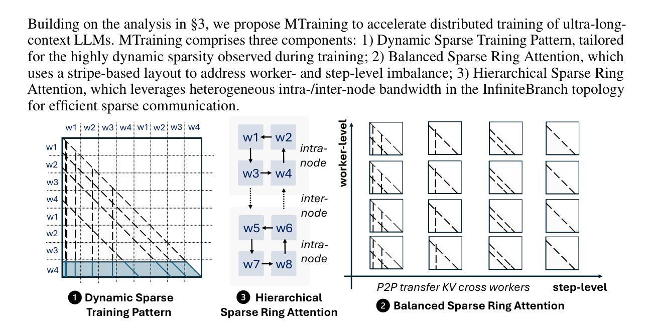大型语言模型(LLM)中采用长上下文窗口已成为标准特性,扩展的上下文显著提高了其复杂推理能力并拓宽了应用场景范围。动态稀疏注意力是一种降低长上下文计算成本的有前途的方法。然而,在分布式设置中,使用动态稀疏注意力有效地训练LLM处理超长上下文仍存在挑战,主要体现在工作级别和步骤级别的失衡。本文提出MTraining,这是一种新型分布式方法,利用动态稀疏注意力实现LLM的超长上下文高效训练。MTraining包含三个关键组件:动态稀疏训练模式、平衡稀疏环形注意力和分层稀疏环形注意力。这些组件协同解决动态稀疏注意力机制在模型训练过程中的计算不平衡和通信开销问题,特别是针对长上下文长度的情况。通过在一个包含32个A100 GPU的集群上对Qwen2.5-3B进行训练,成功将其上下文窗口从32K扩展到512K令牌,展示了MTraining的有效性。在多种下游任务上的评估表明,MTraining实现了高达6倍的培训吞吐量,同时保持了模型精度。