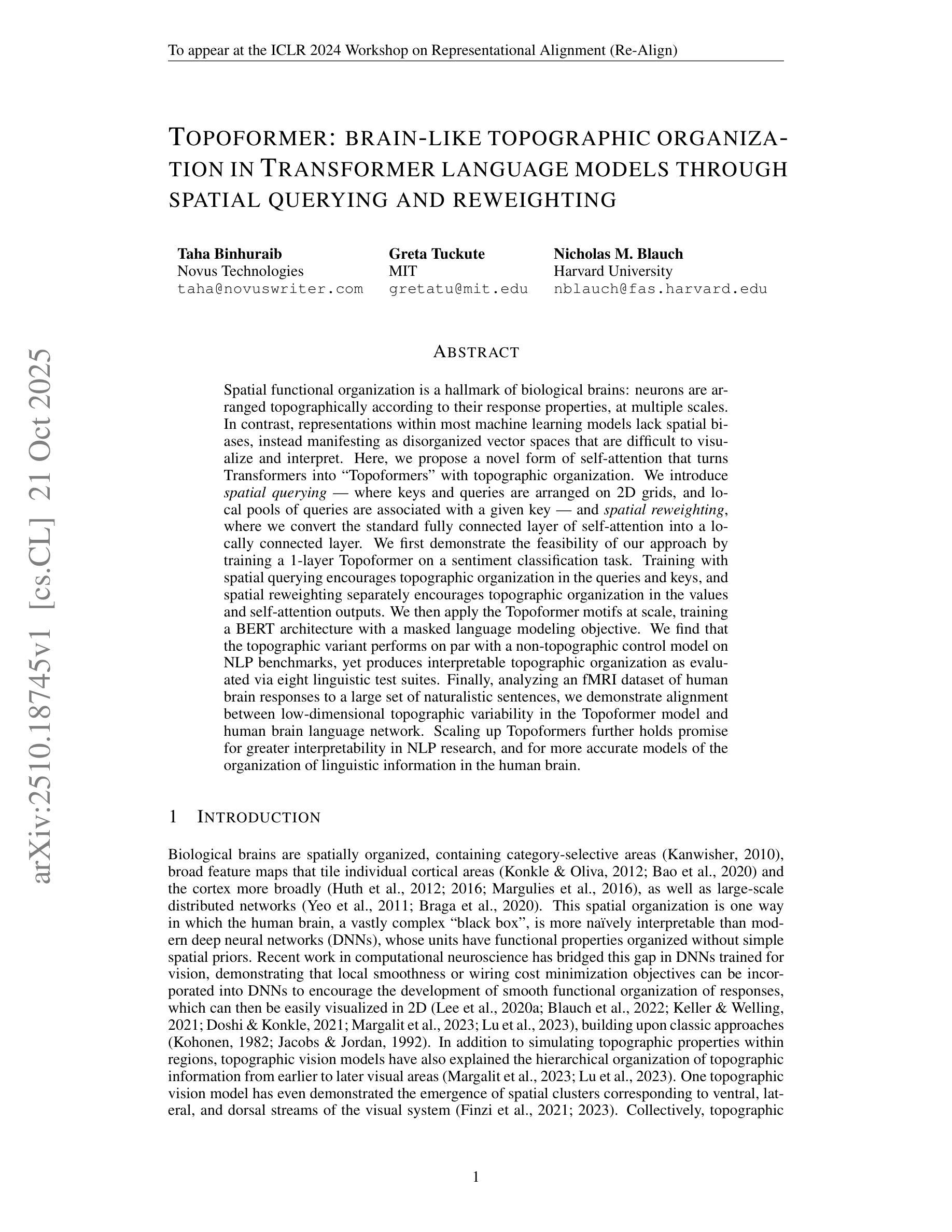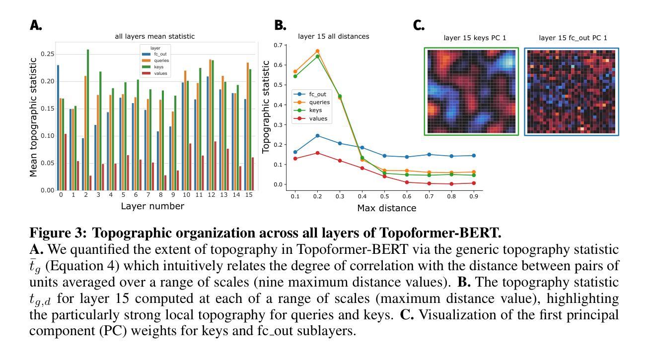 本文提出了带有地形组织结构的“Topoformer”模型,该模型通过引入空间查询和空间重加权机制,使Transformer模型具备地形组织特性。在情感分类任务上的实验证明该方法的可行性。将其应用于BERT架构并进行语言建模任务,结果显示Topoformer模型性能与常规模型相当,但具备可解释的地形组织结构。此外,通过与人类大脑语言网络的对比研究,发现Topoformer模型的低维地形变化与人类大脑响应之间存在一致性。