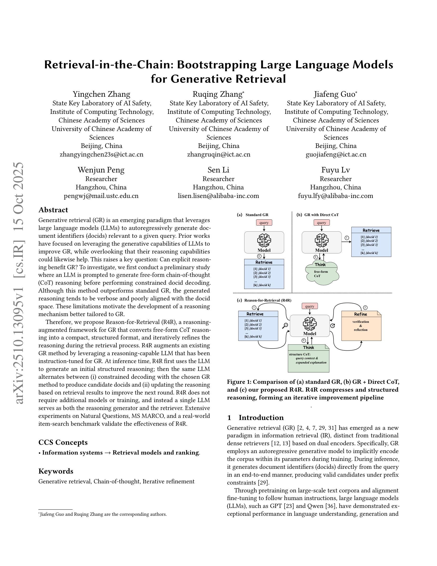 该文探讨了生成式检索(GR)领域的一个新兴问题,即如何利用大型语言模型(LLM)中的推理能力来提升GR的效果。文章首先回顾了以往研究中只关注LLM的生成能力而忽视其推理能力的局限性,并提出一个重要问题:明确推理能否有益于GR。为探究这一问题,文章提出了一种名为Reason-for-Retrieval(R4R)的框架,该框架将自由形式的链式思维(CoT)推理转化为紧凑的结构化格式,并在检索过程中迭代优化推理。R4R通过利用经过指导训练的具备推理能力的LLM来增强现有的GR方法。在推理阶段,R4R首先使用LLM生成初始结构化推理,然后交替进行约束解码与基于检索结果的推理更新,以改进下一轮的检索。R4R只需一个LLM即可同时作为推理生成器和检索器,无需额外的模型或训练。实验结果表明,R4R在自然问题、MS MARCO以及真实物品搜索等多个数据集上均表现出优异的效果。