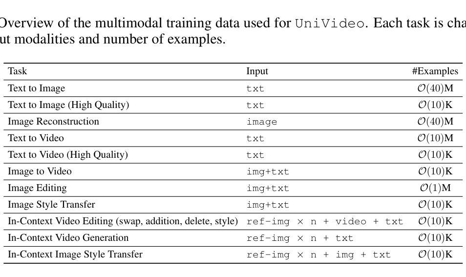 统一多模态模型在多模态内容生成和编辑方面已显示出有前途的结果,但主要局限于图像领域。在这项工作中,我们提出了UniVideo,这是一个通用框架,将统一建模扩展到视频领域。UniVideo采用双流设计,结合用于指令理解的多模态大型语言模型(MLLM)和用于视频生成的多模态DiT(MMDiT)。这种设计能够准确解释复杂的多模态指令,同时保持视觉一致性。基于这种架构,UniVideo将各种视频生成和编辑任务统一在单一的多模态指令范式下,并在这些任务上进行联合训练。大量实验表明,UniVideo在文本/图像到视频生成、上下文视频生成和上下文视频编辑方面达到了或超越了最先进的任务特定基准。值得注意的是,UniVideo的统一设计实现了两种形式的泛化。首先,UniVideo支持任务组合,例如通过单个指令集成多种功能来结合编辑与风格转换。其次,即使在没有针对自由形式视频编辑的明确训练的情况下,UniVideo也能将其编辑能力从大规模图像编辑数据转移到这一环境中,处理未见过的指令,如在视频中抠像或更改材质。除了这些核心能力之外,UniVideo还支持基于视觉提示的视频生成,其中MLLM解释视觉提示并在合成过程中引导MMDiT。为了促进未来的研究,我们将发布我们的模型和代码。