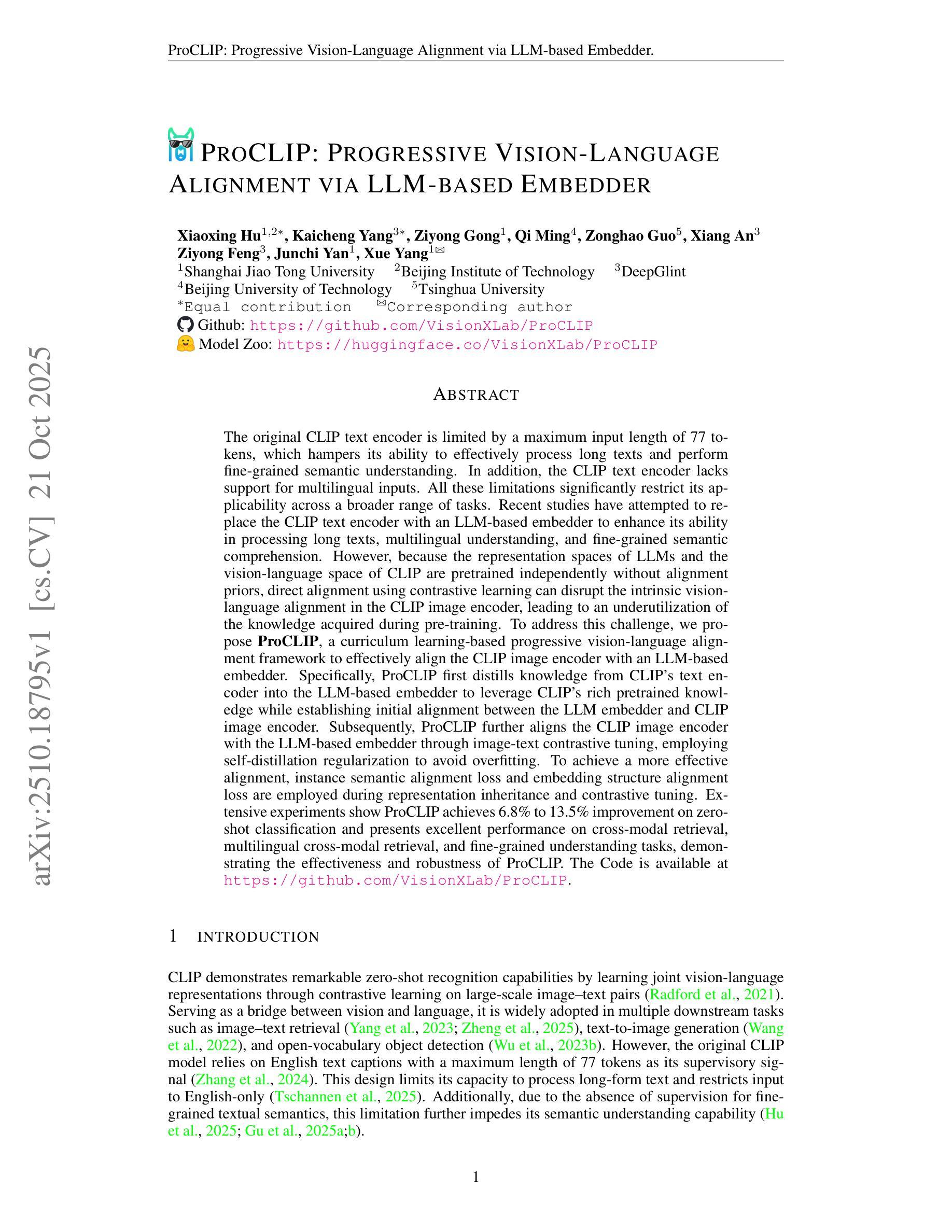 The original CLIP text encoder is limited by a maximum input length of 77 tokens, which hampers its ability to effectively process long texts and perform fine-grained semantic understanding. In addition, the CLIP text encoder lacks support for multilingual inputs. All these limitations significantly restrict its applicability across a broader range of tasks. Recent studies have attempted to replace the CLIP text encoder with an LLM-based embedder to enhance its ability in processing long texts, multilingual understanding, and fine-grained semantic comprehension. However, because the representation spaces of LLMs and the vision-language space of CLIP are pretrained independently without alignment priors, direct alignment using contrastive learning can disrupt the intrinsic vision-language alignment in the CLIP image encoder, leading to an underutilization of the knowledge acquired during pre-training. To address this challenge, we propose ProCLIP, a curriculum learning-based progressive vision-language alignment framework to effectively align the CLIP image encoder with an LLM-based embedder. Specifically, ProCLIP first distills knowledge from CLIP’s text encoder into the LLM-based embedder to leverage CLIP’s rich pretrained knowledge while establishing initial alignment between the LLM embedder and CLIP image encoder. Subsequently, ProCLIP further aligns the CLIP image encoder with the LLM-based embedder through image-text contrastive tuning, employing self-distillation regularization to avoid overfitting. To achieve a more effective alignment, instance semantic alignment loss and embedding structure alignment loss are employed during representation inheritance and contrastive tuning. The Code is available at https://github.com/VisionXLab/ProCLIP