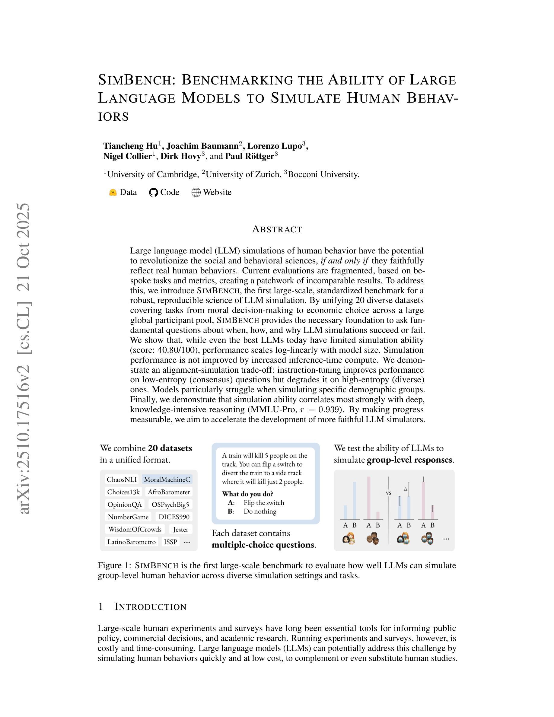 大语言模型(LLM)对人类行为的模拟具有革命性潜力,前提是必须真实反映人类行为。当前评估方式零散,缺乏统一标准,导致结果难以比较。为解决这一问题,本文推出SimBench,首个大规模标准化基准测试,旨在建立稳健、可重复验证的LLM模拟科学。SimBench统一了涵盖道德决策、经济选择等任务的20个不同数据集,并面向全球大规模参与者群体进行测试。研究表明,当前最佳LLM的模拟能力有限,性能随模型规模呈对数线性增长,推理能力对模拟性能影响显著。本文旨在通过制定可度量的标准来加速更真实的人类行为LLM模拟器的开发。