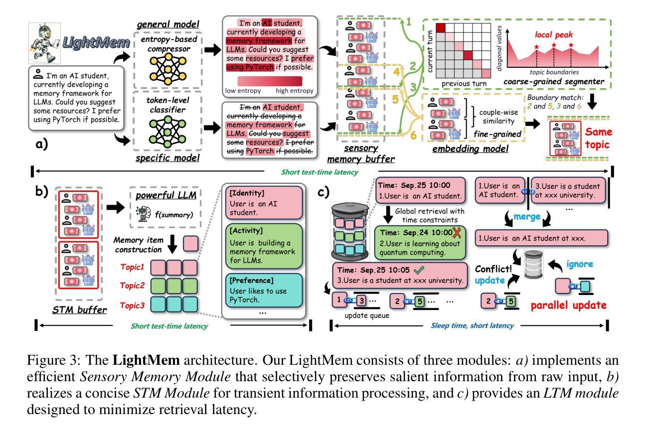 大型语言模型(LLMs)在动态复杂环境中难以有效利用历史交互信息。内存系统的引入使LLMs能够通过持久性信息存储、检索和利用机制来超越无状态交互。然而,现有内存系统往往带来巨大的时间和计算开销。为此,我们提出了一个新的内存系统LightMem,它在性能和效率之间达到了平衡。LightMem受到人类记忆Atkinson-Shiffrin模型的启发,将记忆分为三个阶段。首先,认知启发的感觉记忆通过轻量级压缩快速过滤无关信息并按主题分组信息。其次,主题感知的短期记忆巩固这些基于主题的分组,组织和总结内容以进行更结构化的访问。最后,具有睡眠时更新的长期记忆采用离线程序,将巩固与在线推理解耦。在LongMemEval上的实验表明,LightMem在准确性方面优于强大的基线(提高了高达10.9%),同时减少了令牌使用(高达117倍)、API调用(高达159倍),并降低了运行时间(超过12倍)。