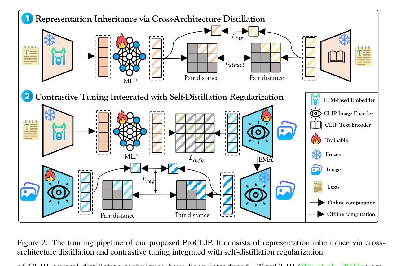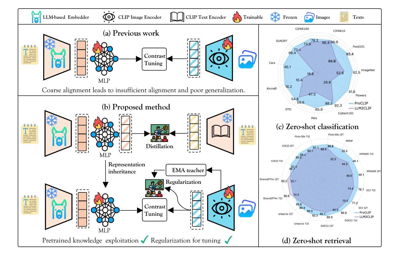 - ProCLIP利用蒸馏技术将CLIP文本编码器的知识转移到LLM嵌入器中。