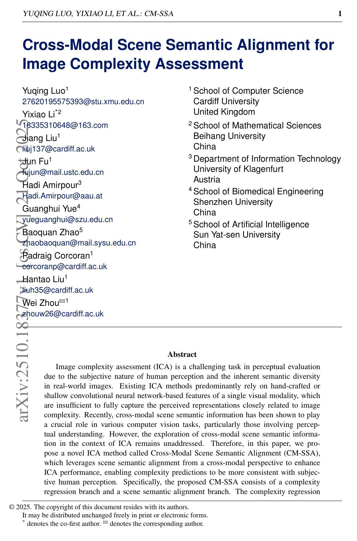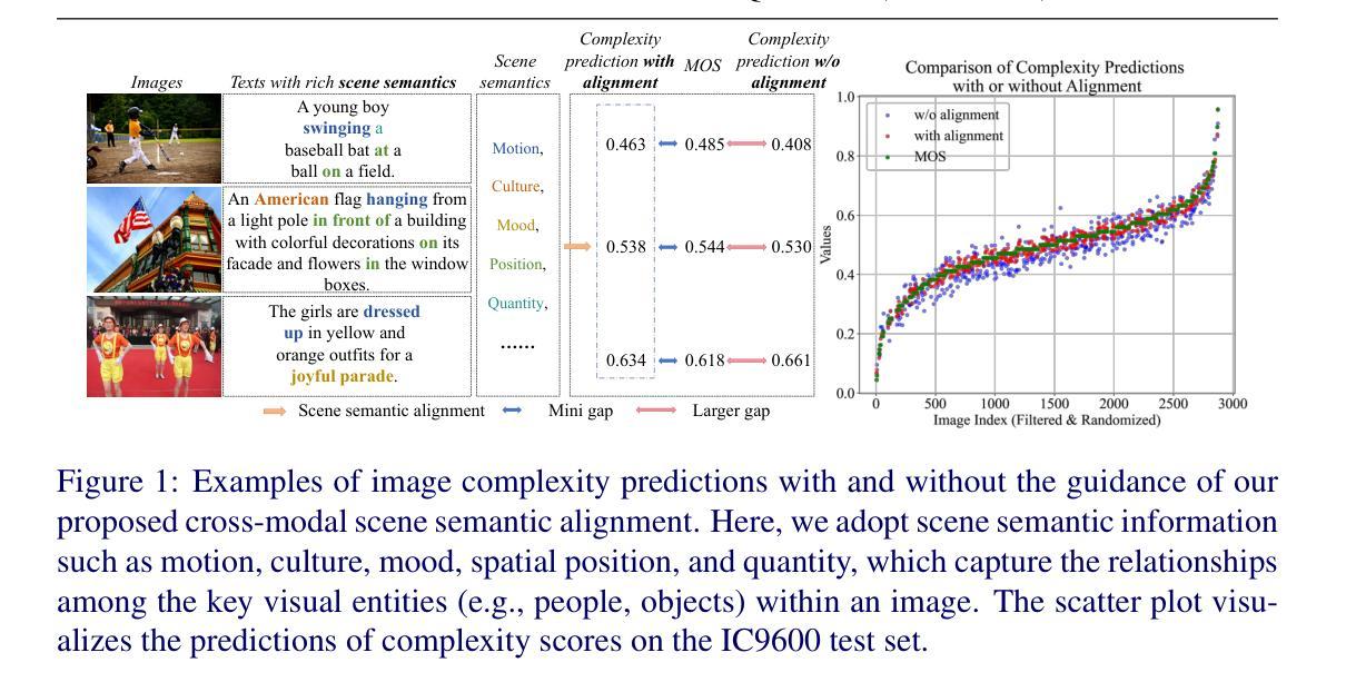 本文提出一种名为Cross-Modal Scene Semantic Alignment(CM-SSA)的新方法,用于图像复杂度评估(ICA)。该方法利用跨模态场景语义对齐技术,提高ICA性能,使复杂度预测更符合人类主观感知。CM-SSA包括复杂度回归分支和场景语义对齐分支,前者在后者指导下估计图像复杂度水平,后者则通过配对学习将图像与传达丰富场景语义信息的文本提示进行对齐。在多个ICA数据集上的实验表明,CM-SSA显著优于现有方法。